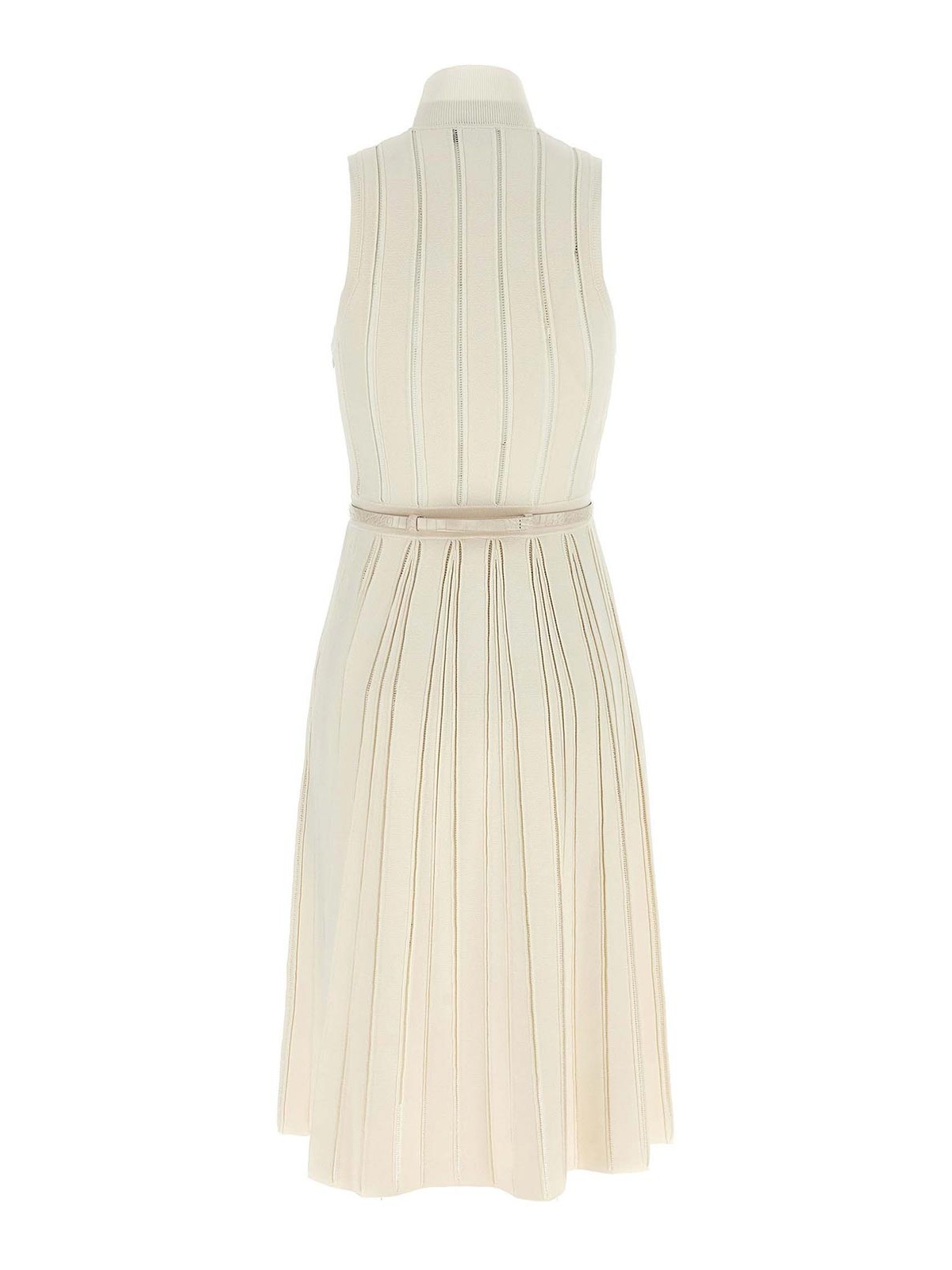 Knit midi dress with banded weave interspersed with jour high neck sleeveless full skirt side zip removable belt