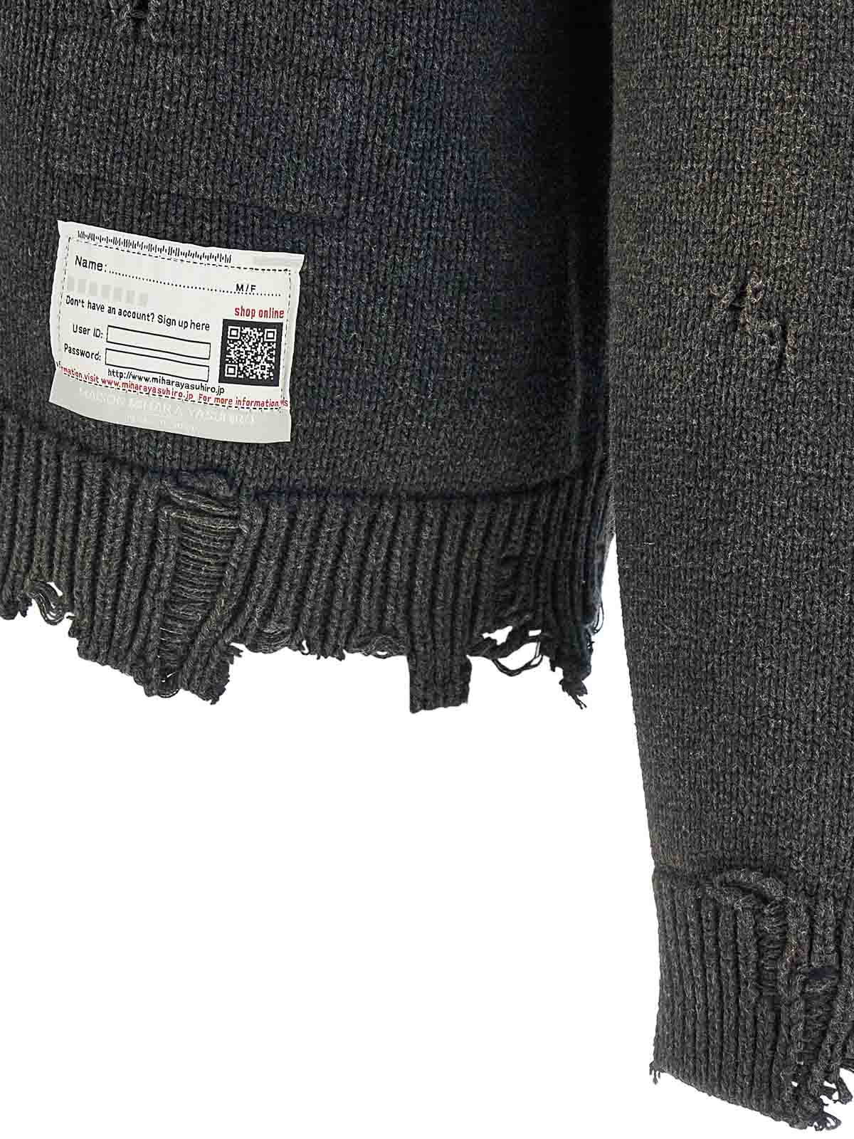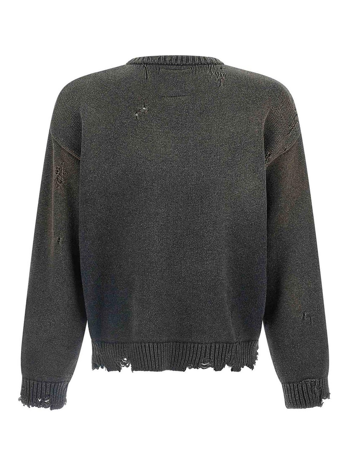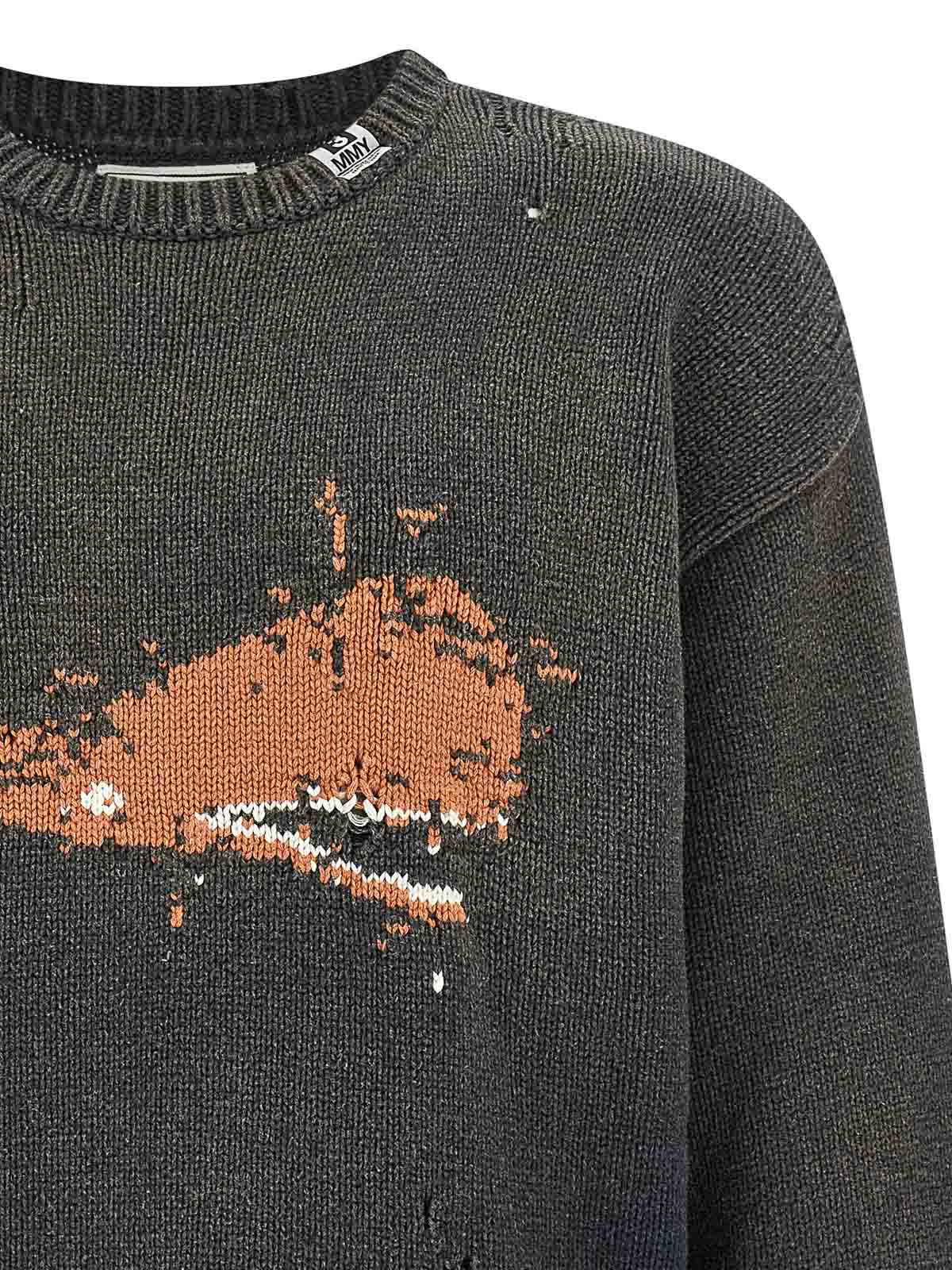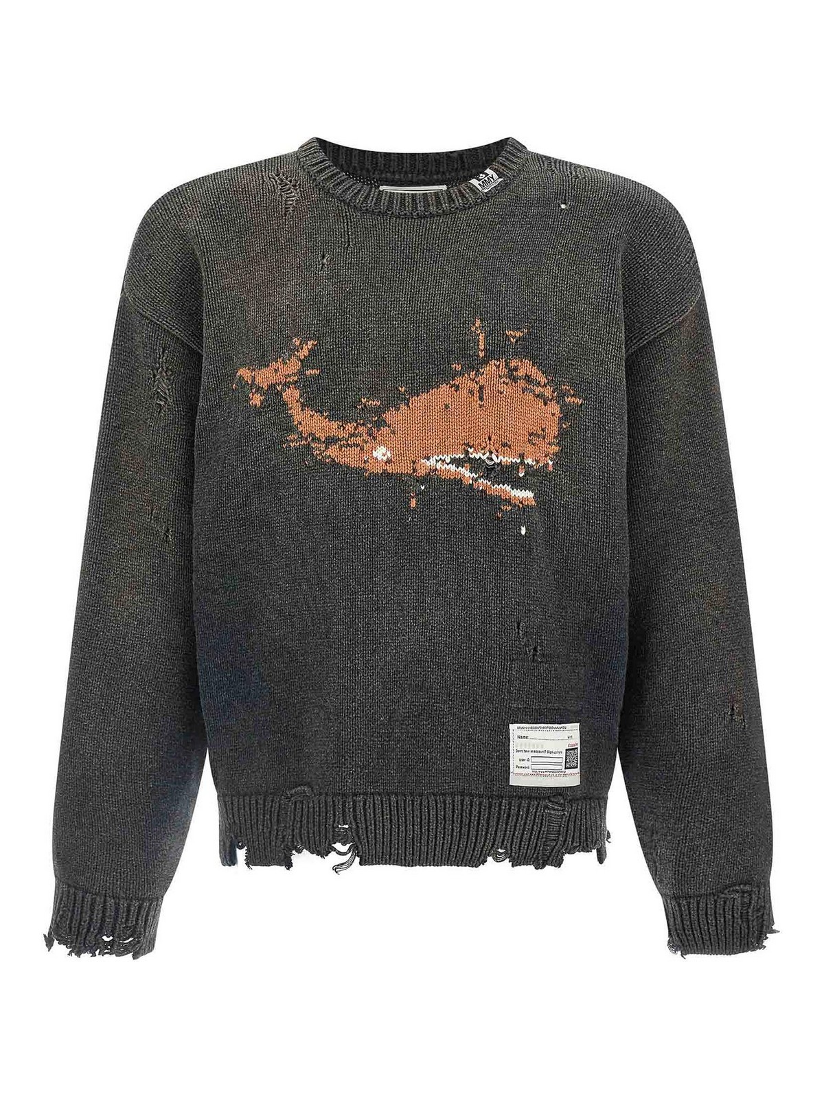 Whale jacquard knit' distressed effect cotton and wool knit sweater with front jacquard pattern, crew neck, logo patch, long sleeves with dropped cuffs and shoulders, frayed hem and sleeves.color, structure and specifications may vary slightly due to differences in production times or the individual characteristics of each part.intentional alterations such as holes, fading, and stains are part of the design and reflect the character of the item. please appreciate these features as part of its unique aesthetic.