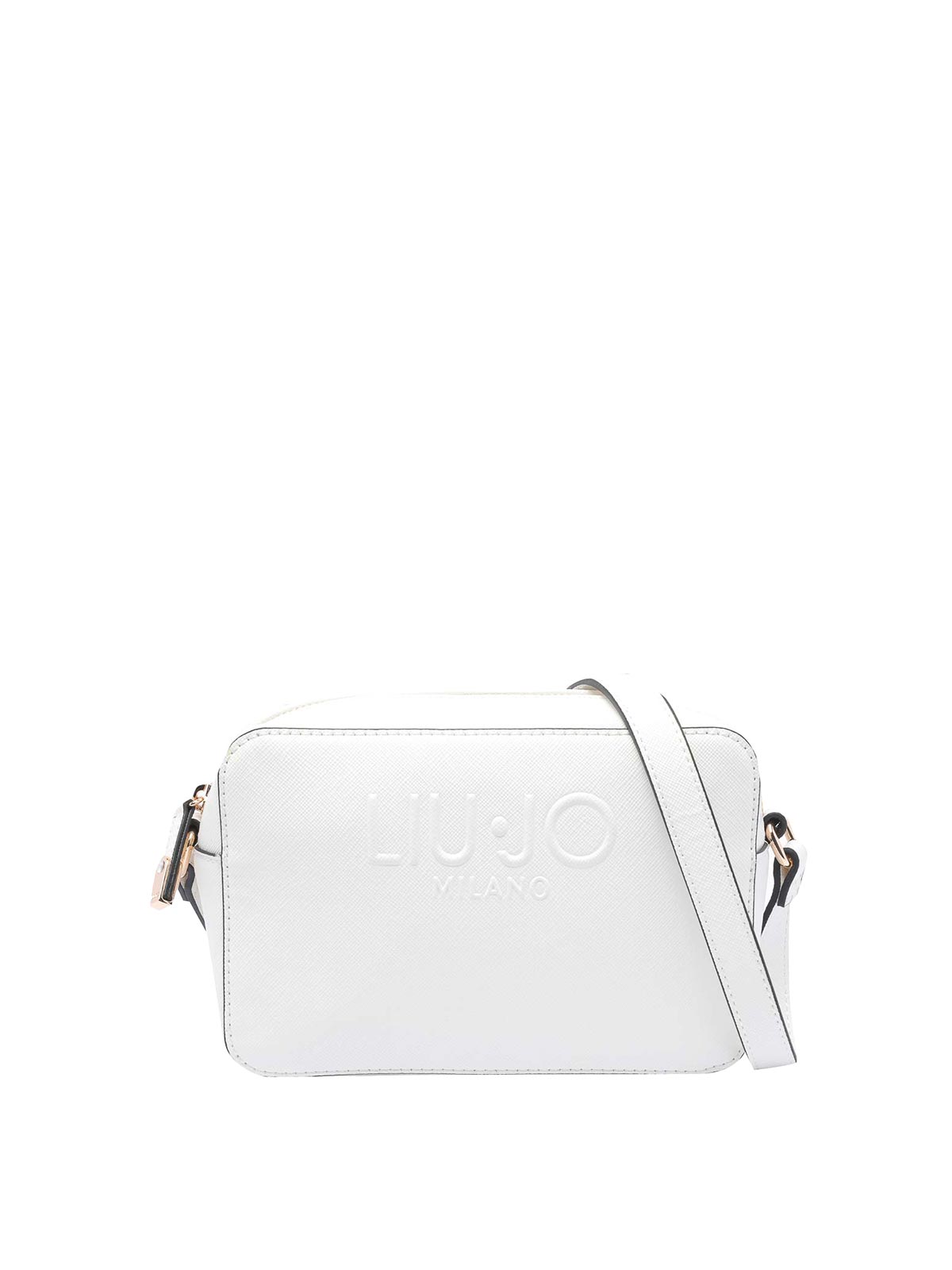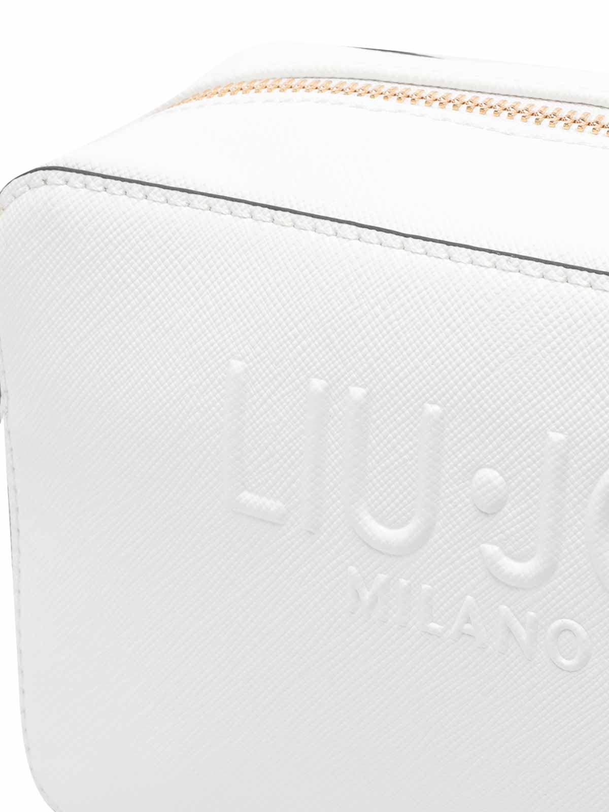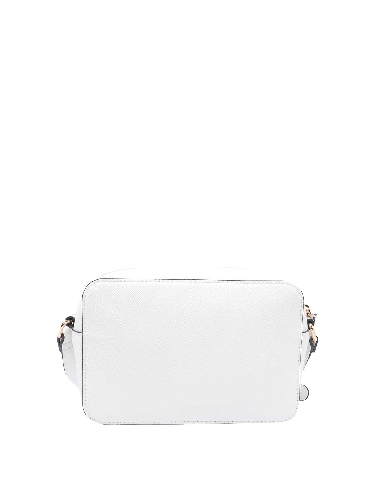 White crossbody bag zip open pocket adjustable shoulder strap logo on the
