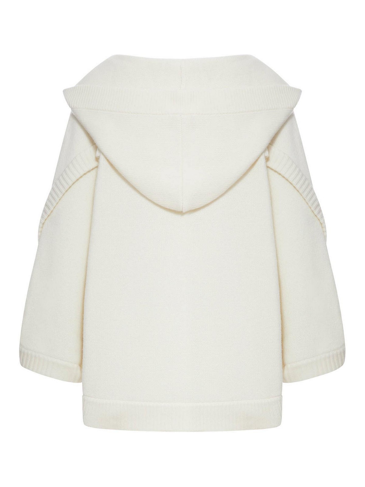 Cardigan in wool and yarn with stocking stitch, raglan sleeves with crossed motif and logo buttons, custom tag bottom left on the, ribbed finishes, color white