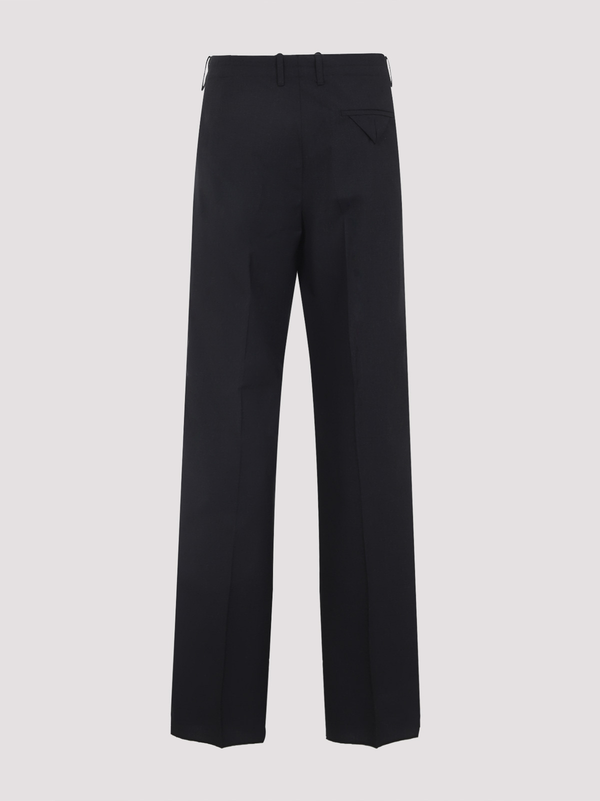 Bottega veneta charcoal grey wool pants. pure charcoal grey wool pants, front concealing zipped and hooked fastening, belt loops, back slit pocket, front pleated detail, tonal stitching, straight hem.