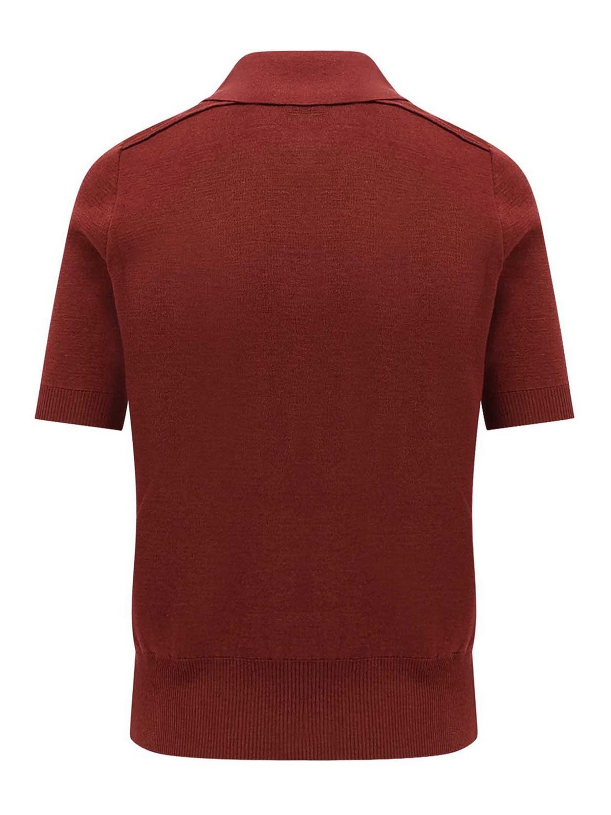 Three button closure, classic pointed collar, short sleeves, ribbed profiles, 100% wool