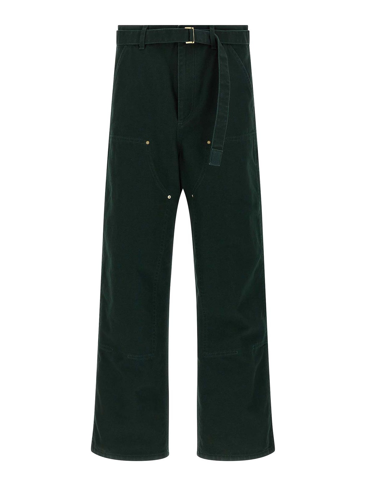 Sacai x carhartt wip capsule pants in heavy cotton canvas, metal rivets, wide and straight leg, front zip and button closure, back logo patch, removable belt.