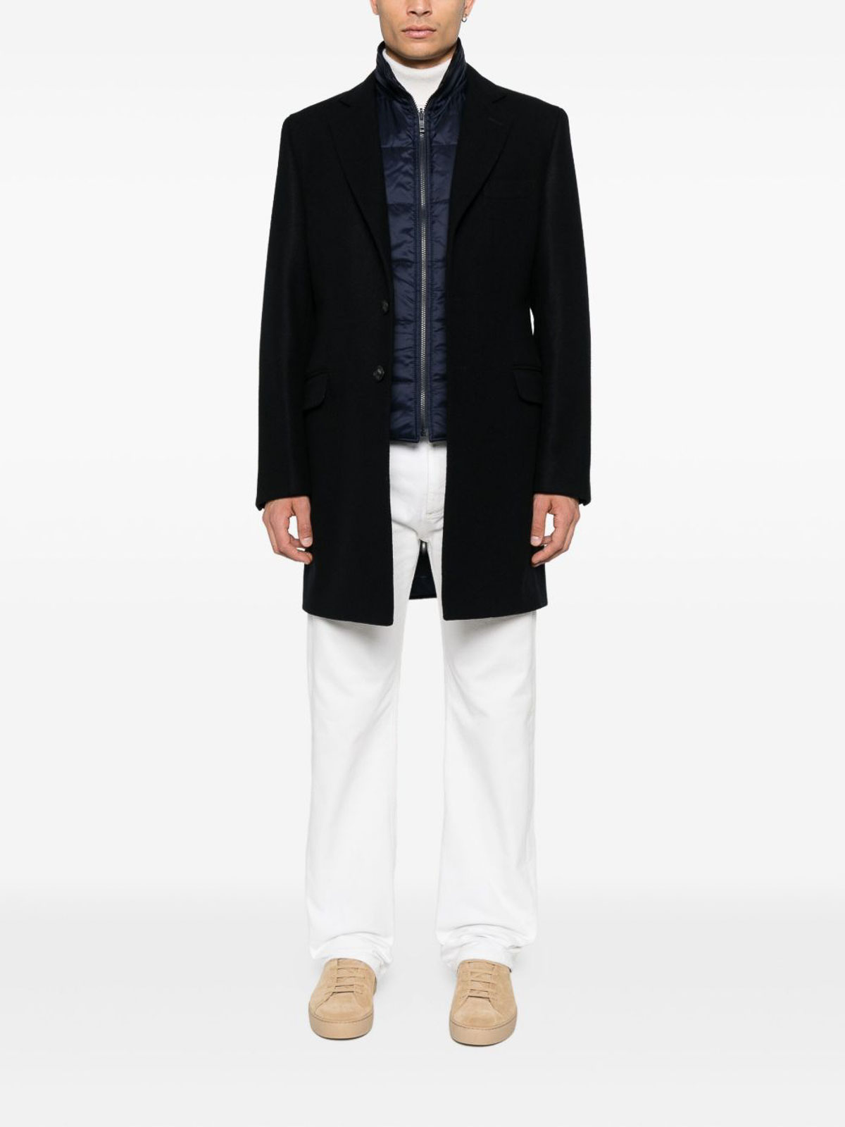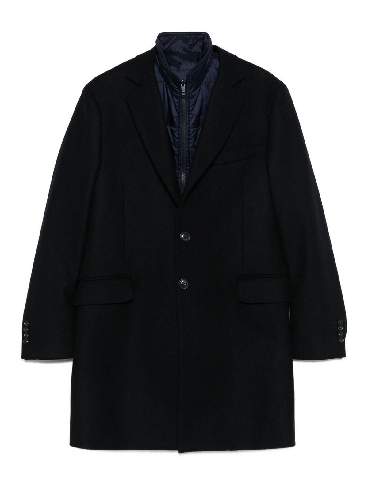 Diseño de capas de botones azul marino, mangas largas, puños abotonados, bolsillos con solapa, dobladillo recto