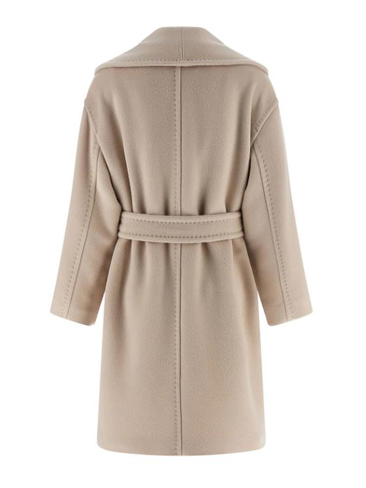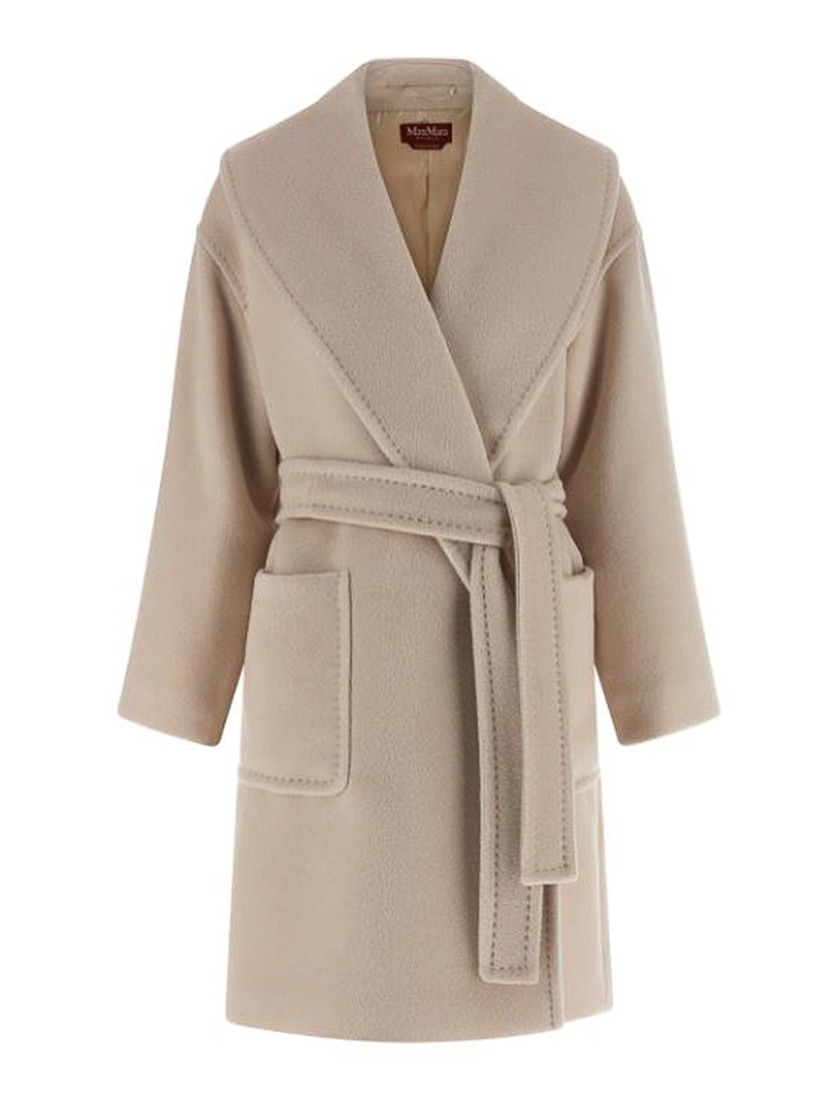 Abrigo corto beige de lana virgen de alpaca y castor, cuello ancho tipo chal, bolsillos, mangas largas con hombros caídos, forro de viscosa con monograma, cinturón extraíble.