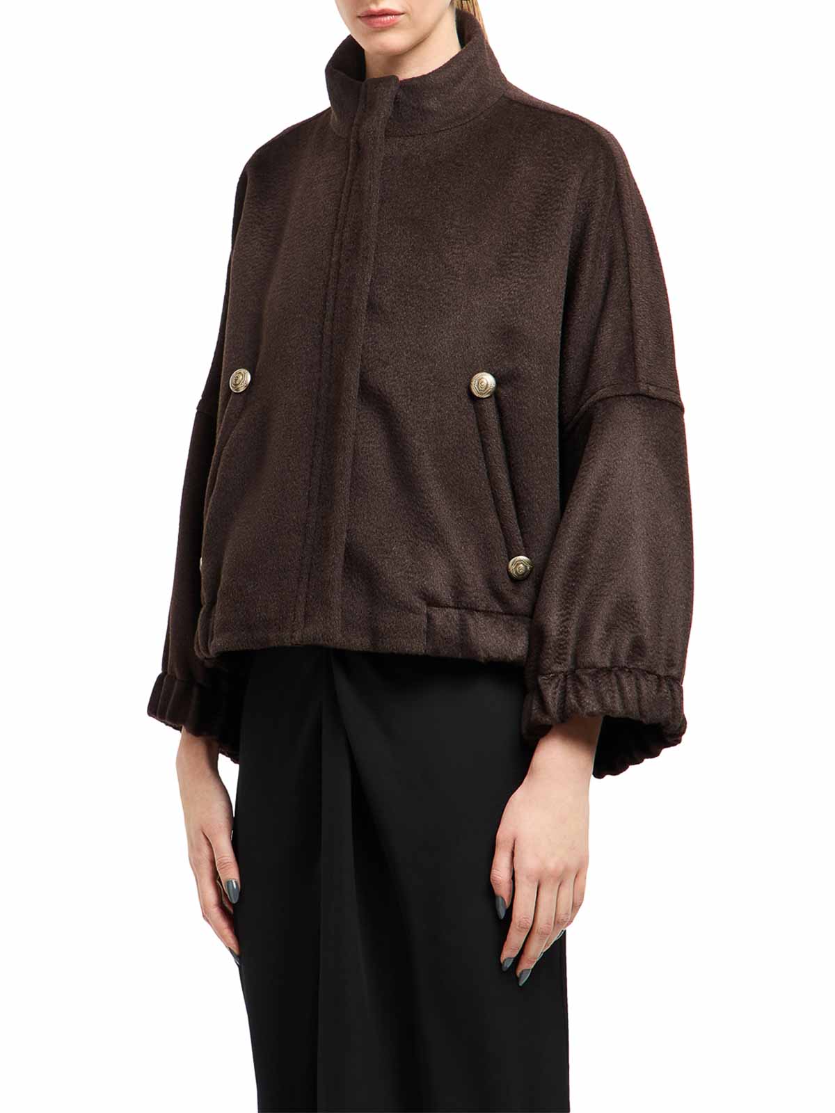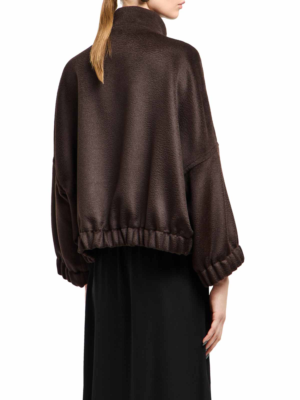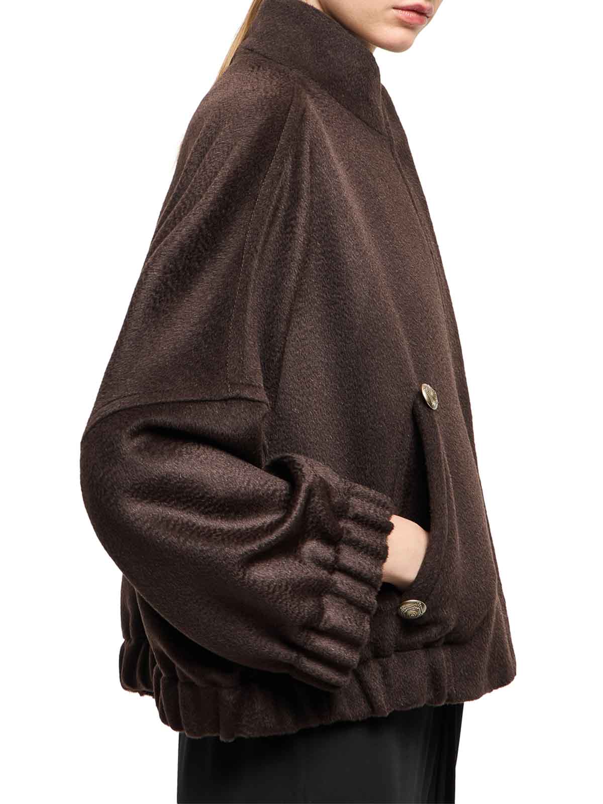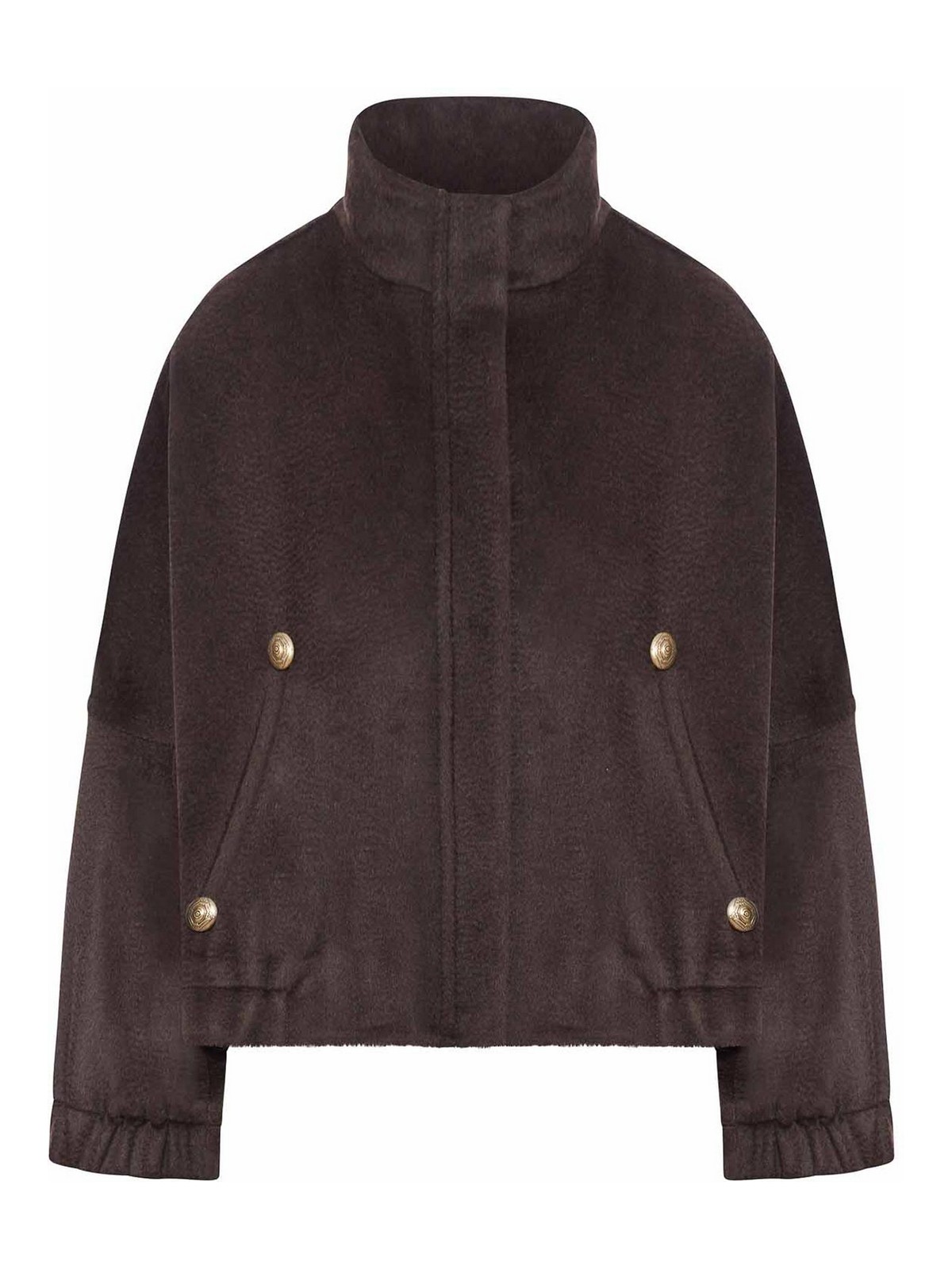 Cuello alto, mangas largas, cremallera oculta, dos bolsillos inclinados con botones con el logotipo, puños y parte inferior elásticos, sin forro, marrón