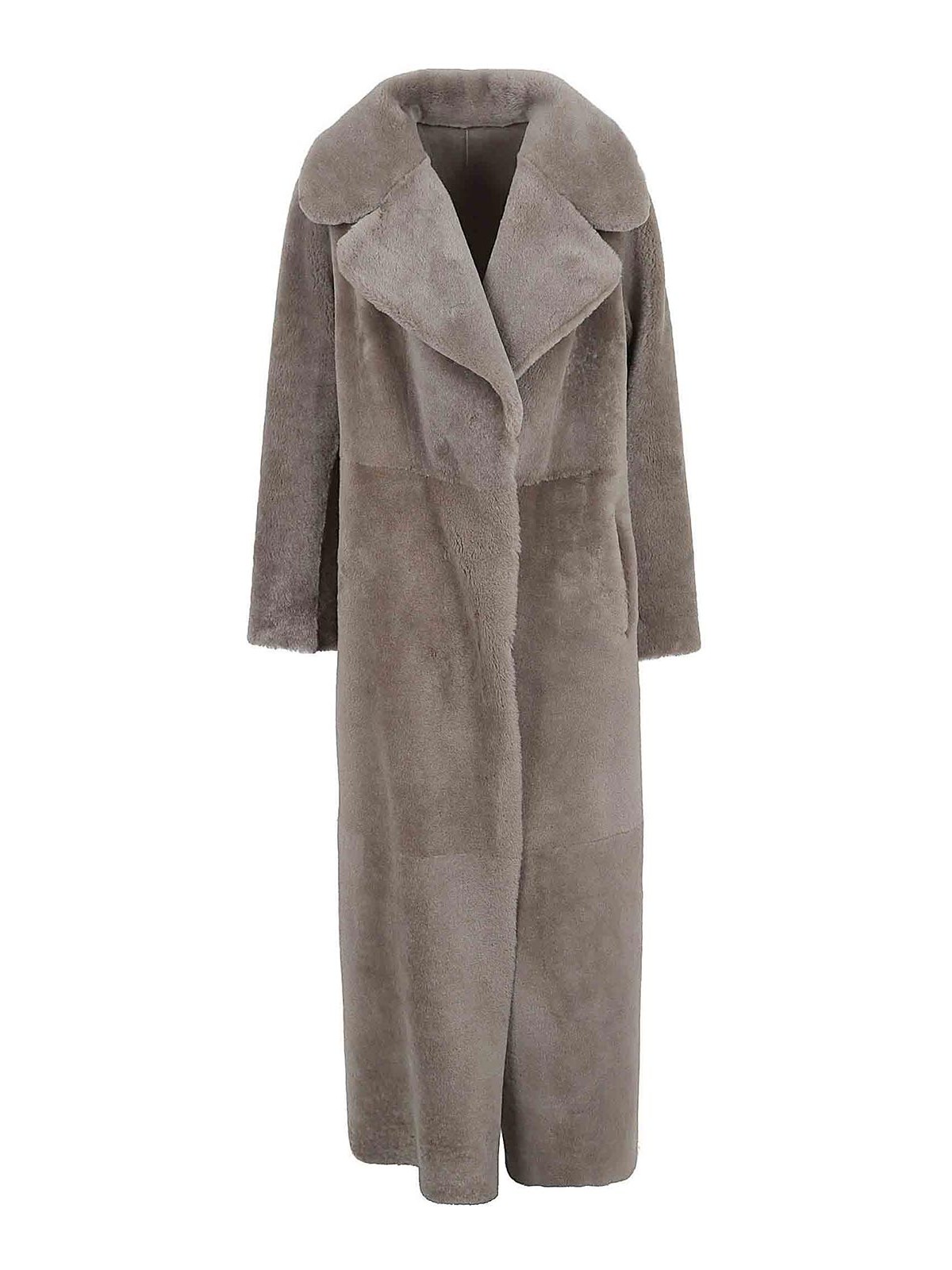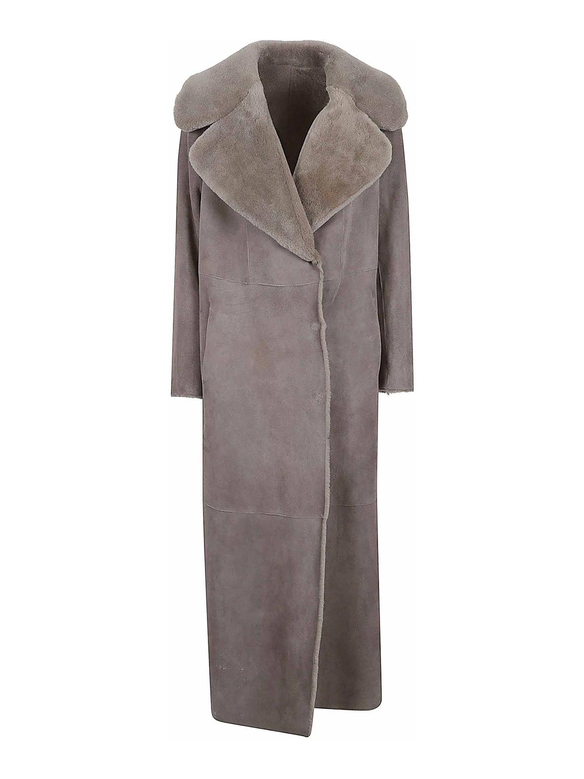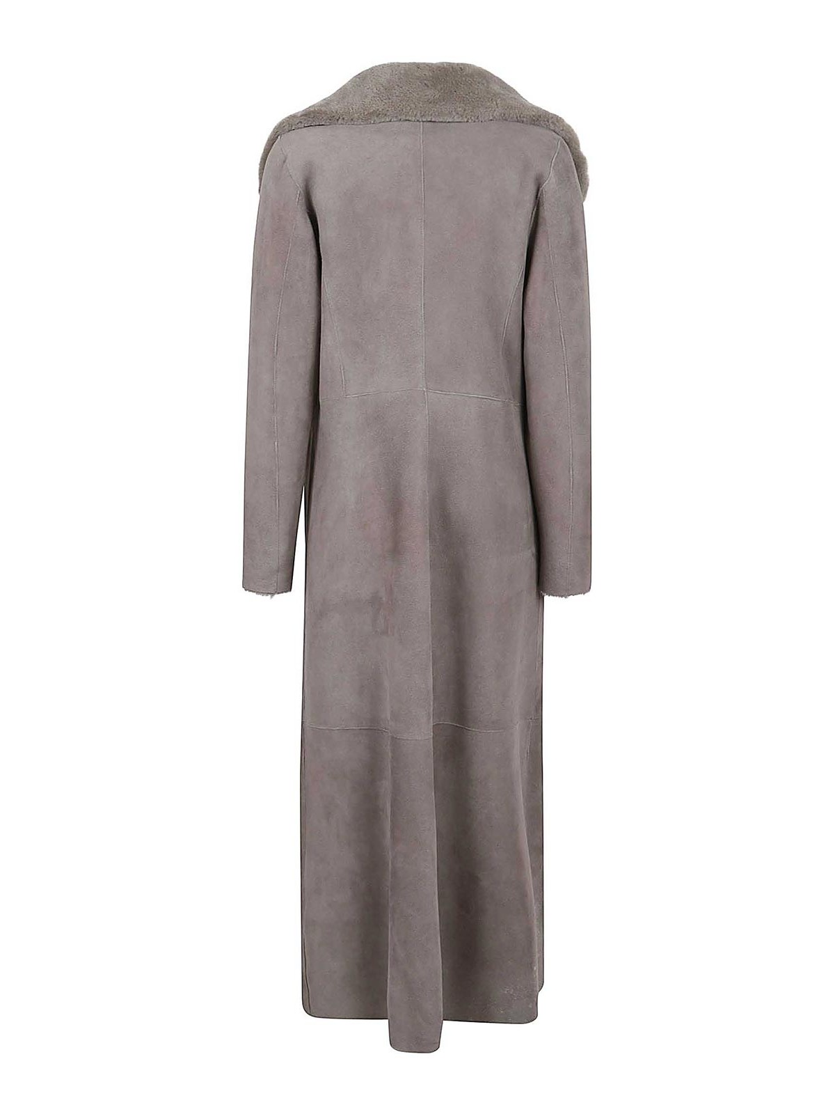 Cuello tipo chal de piel de oveja gris, diseño con paneles, mangas largas, cierre frontal