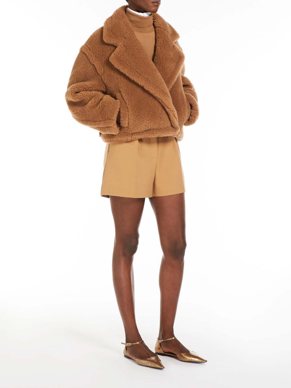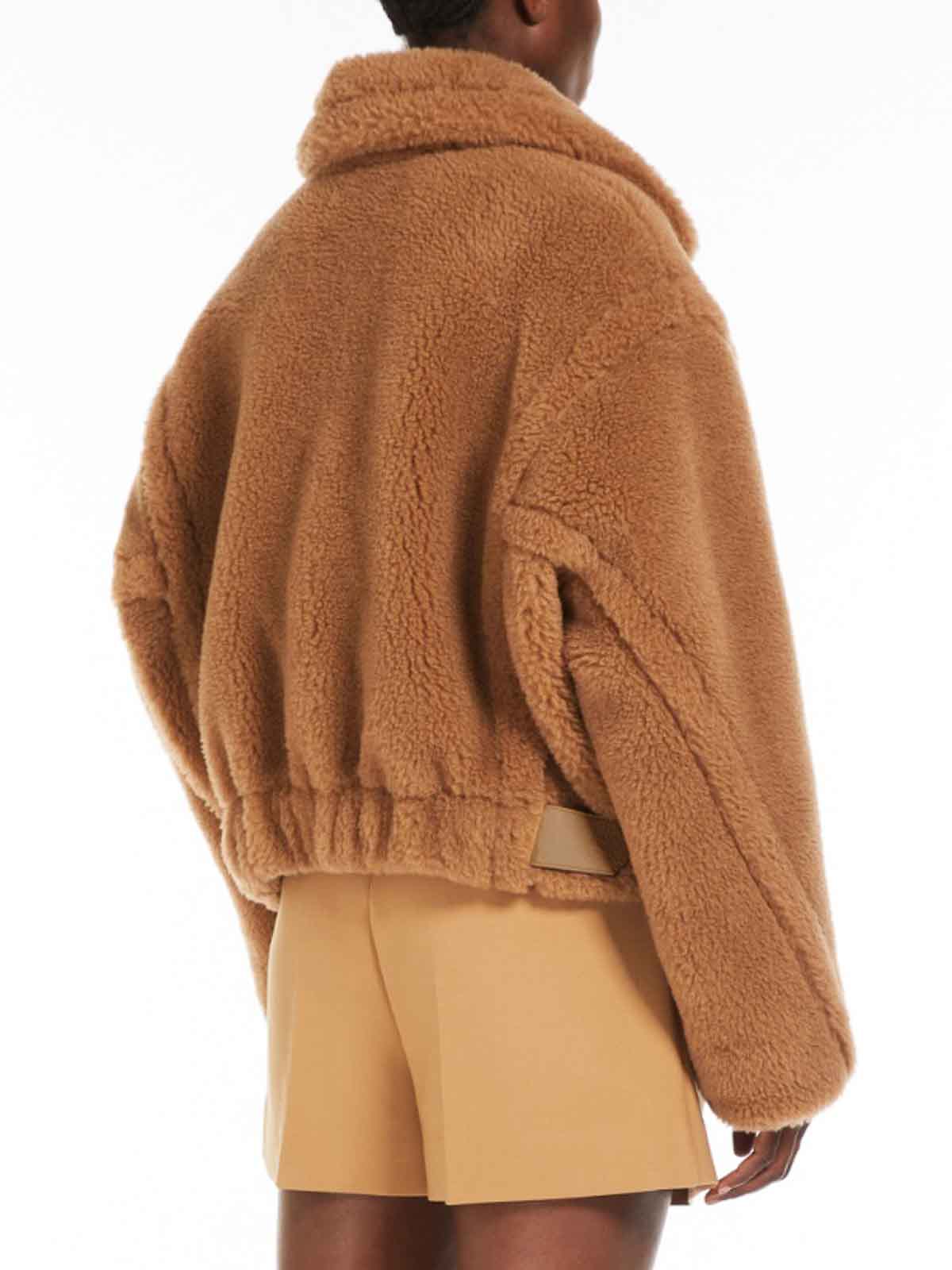 Chaqueta corta con el icónico peluche sobre una base con una silueta sobredimensionada con cintura fruncida en la espalda y botones en los laterales. El modelo presenta un cuello ancho con solapa, un conjunto largo y bajo, mangas y bolsillos ribeteados, forrados en jacquard con monograma, doble botonadura.
