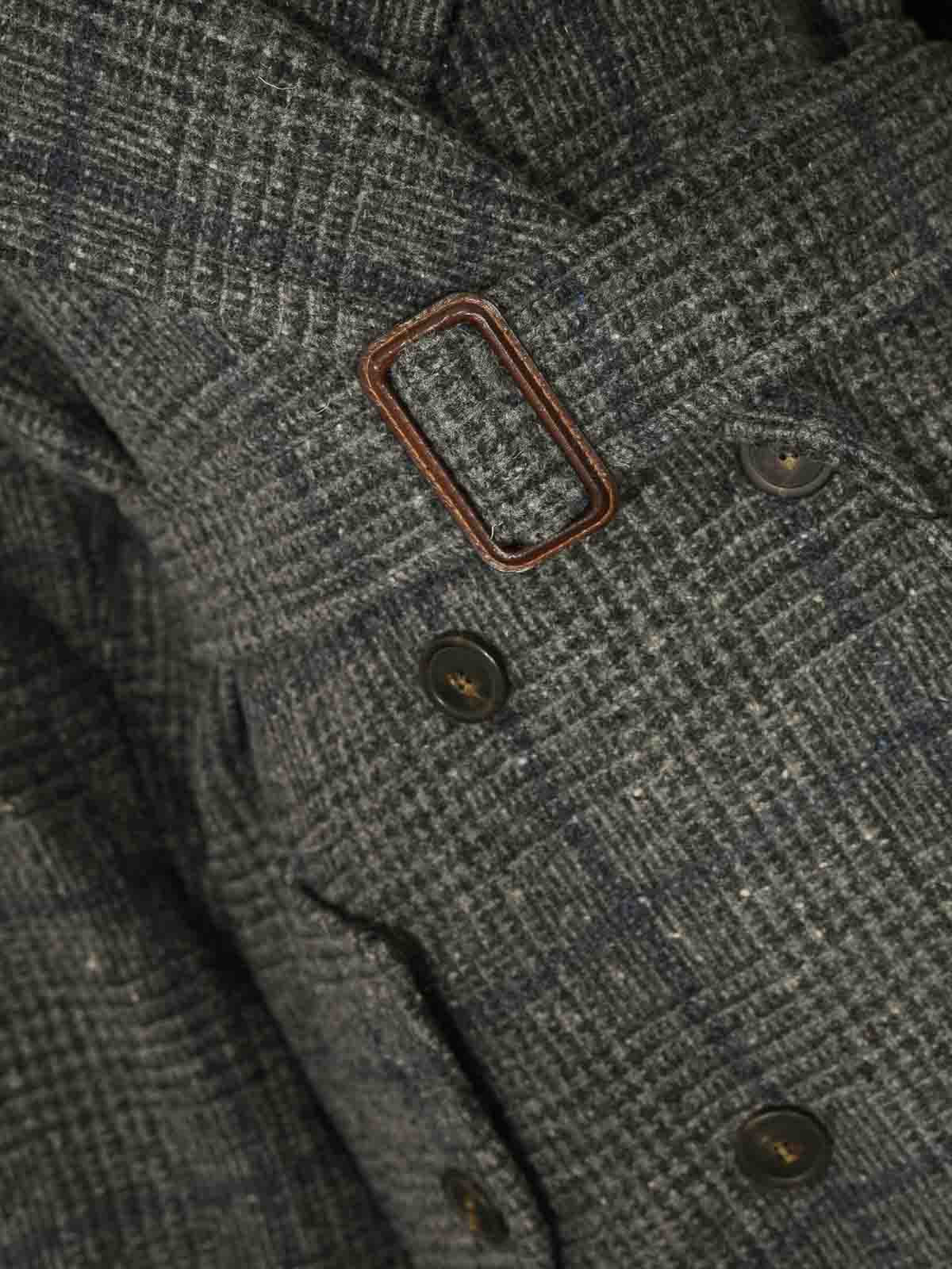 Abrigo largo de tweed en mezcla de tweed a cuadros del príncipe de Gales, mangas raglán largas, puños en V, cuello con solapas, correa para la barbilla, doble botón, cinturón extraíble con hebilla, bolsillos laterales con solapas y botones, ventilación trasera forrada