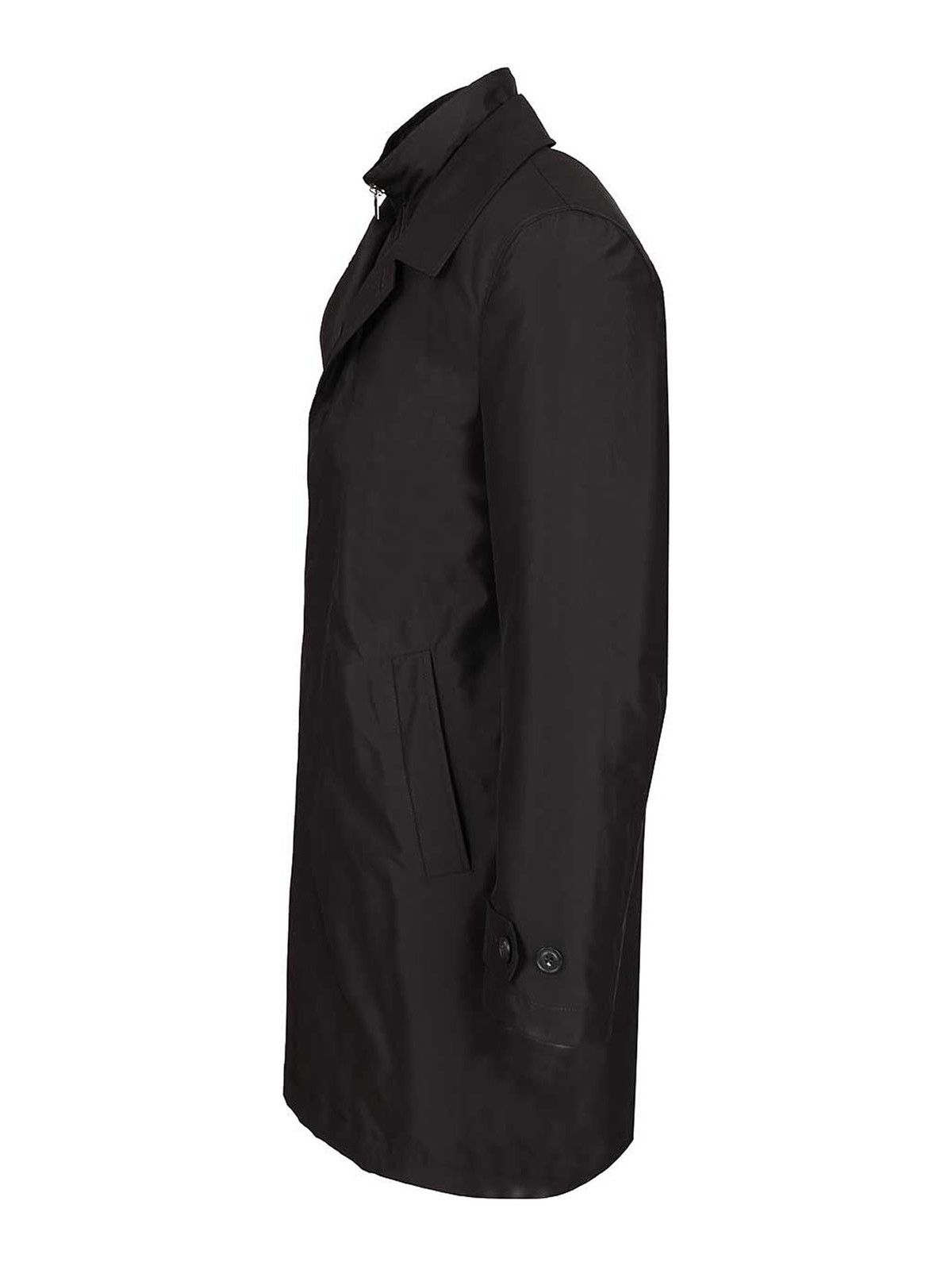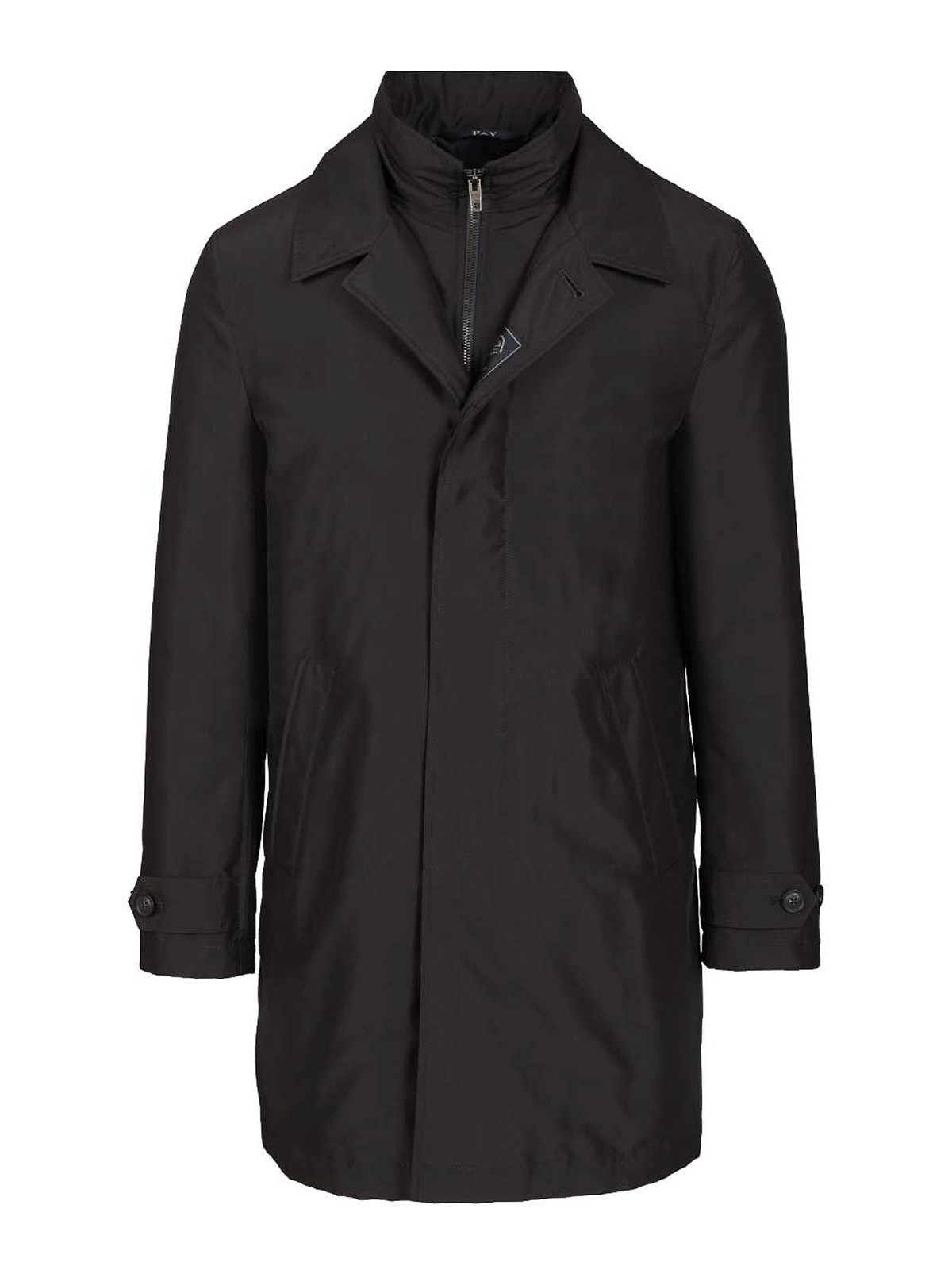 abrigo de mañana en punto técnico hidrófugo de Fay con bolsillos ribeteados y extremos con banda y botón, cuenta con cremallera y botón ocultos y un bolsillo