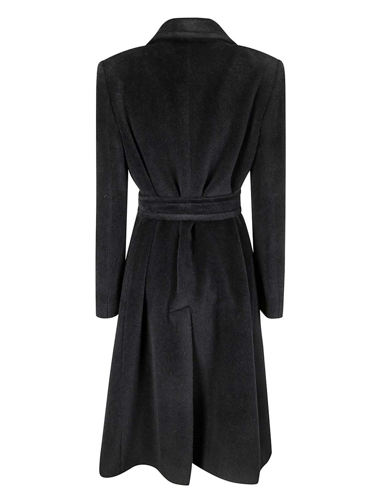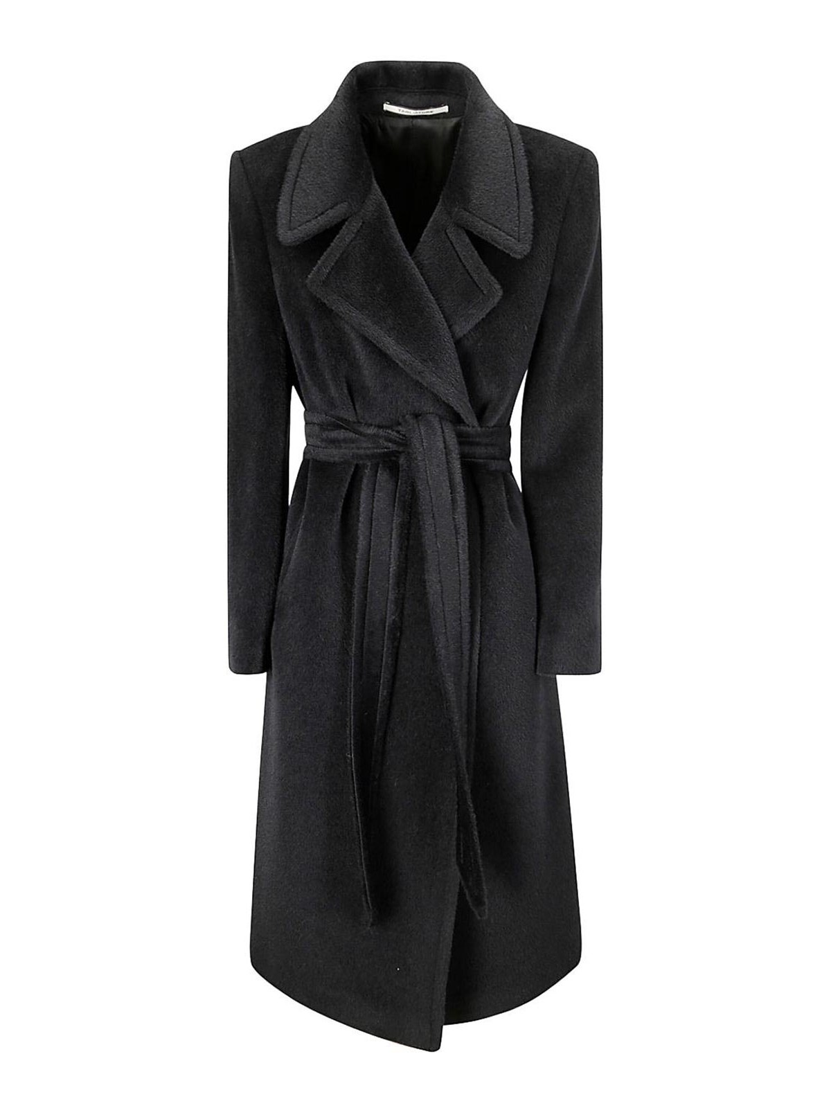 El abrigo negro de tagliatore en mezcla con solapas de pico presenta una correa ajustable desmontable en la cintura, mangas largas y un parche con el logotipo para darle un toque refinado.
