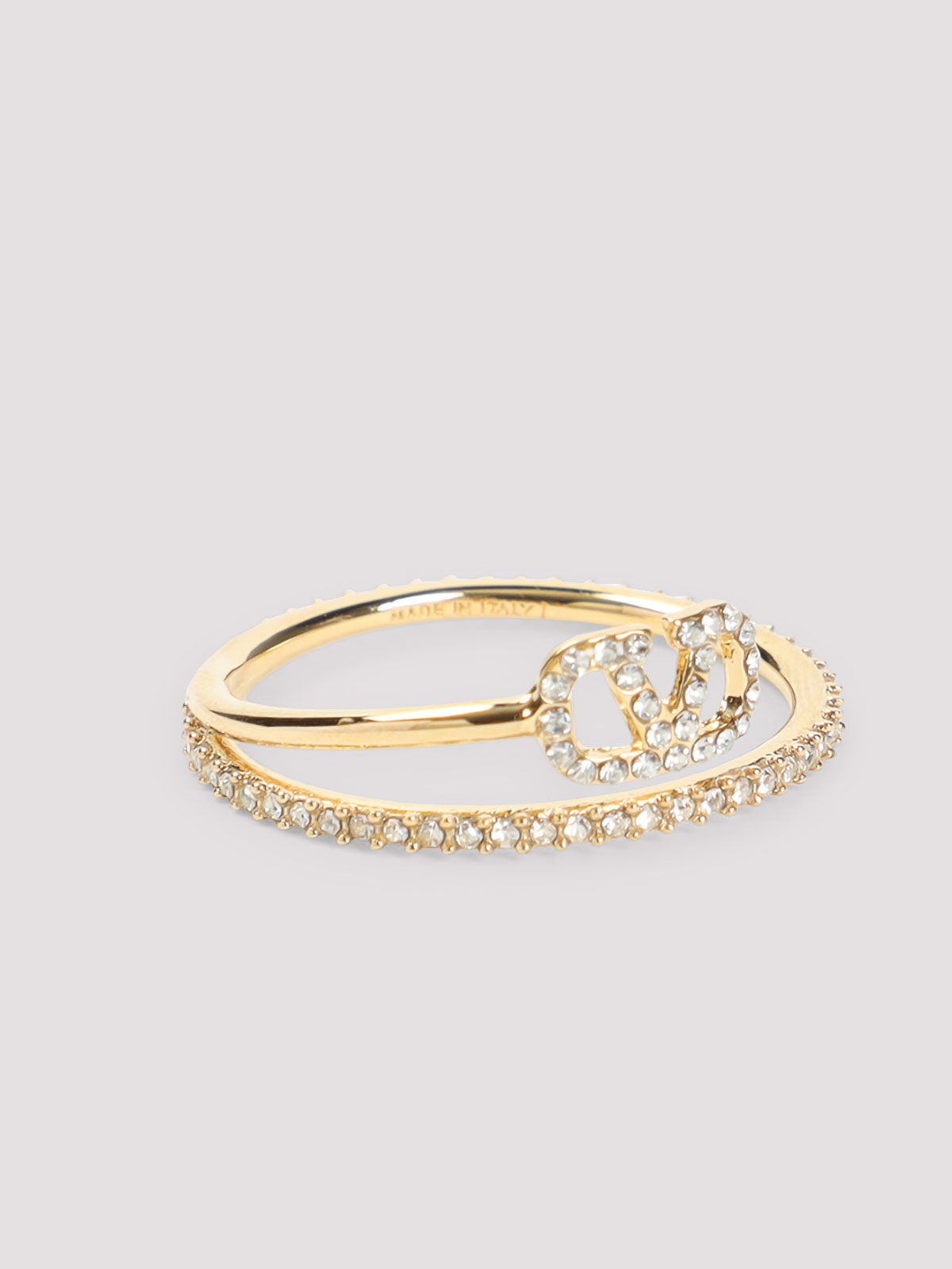 Anillo de latón dorado Valentino Garavani. Anillo de latón en tono oro puro, logotipo en V característico en la parte delantera con detalles de cristal, detalles de cristal en la parte delantera y trasera.