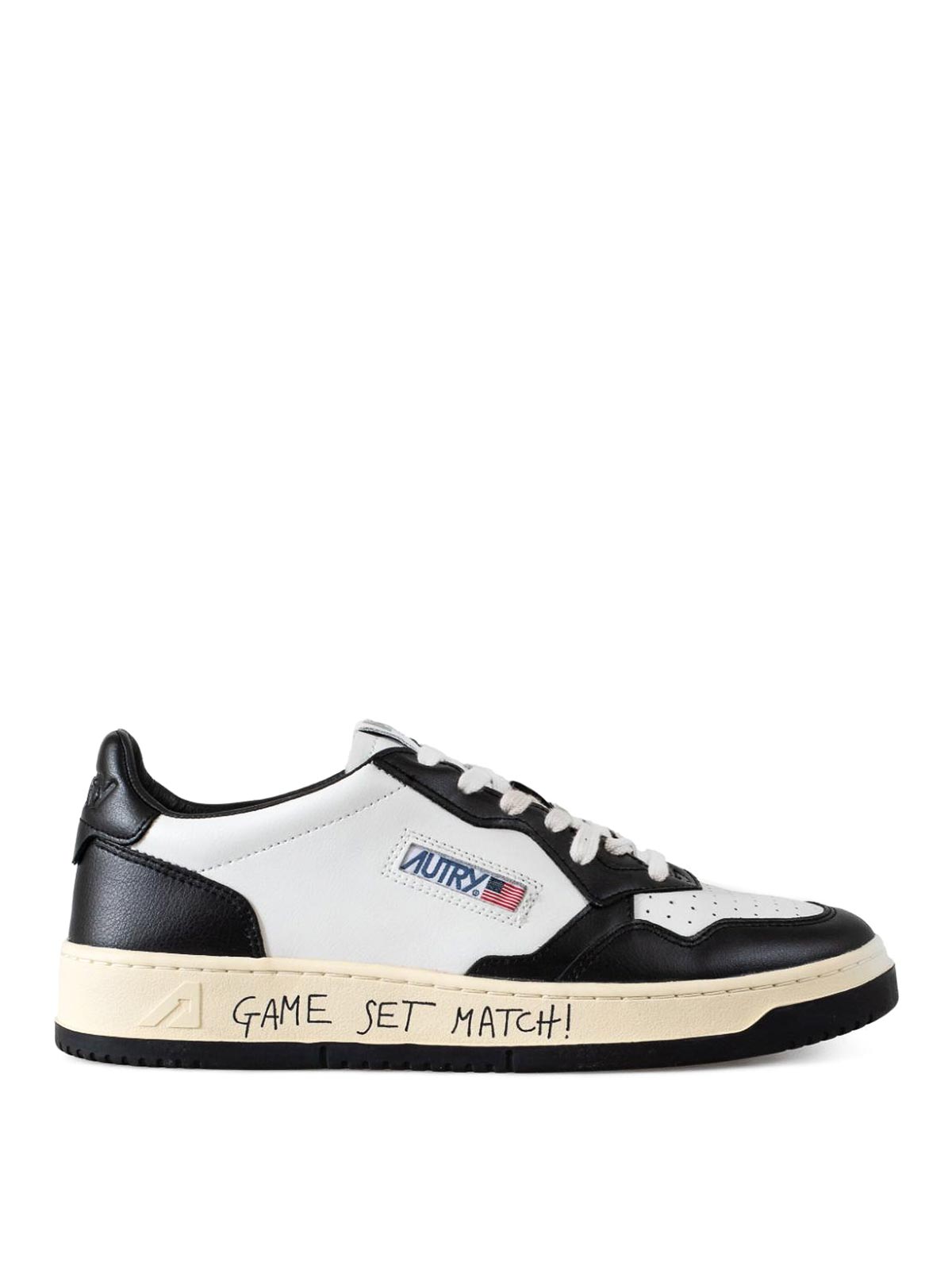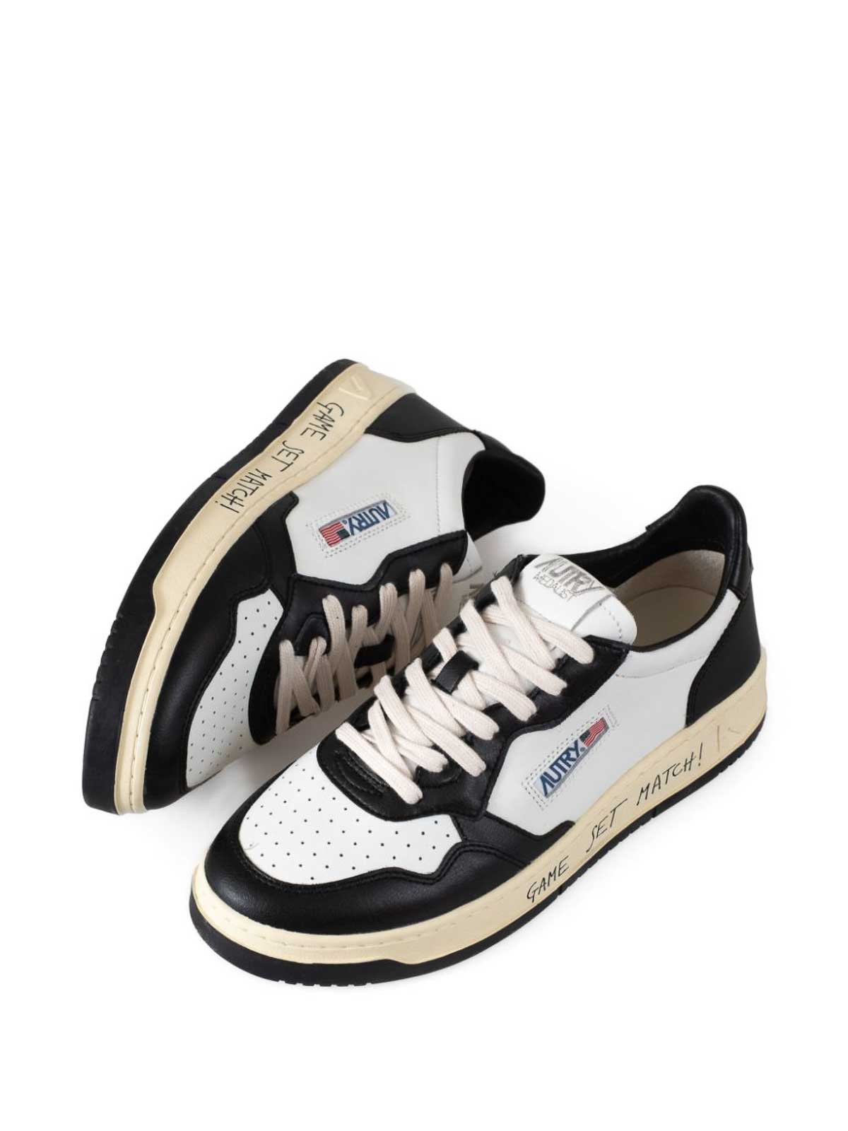 Diseño bicolor en blanco y negro, diseño perforado, estampado de eslogan en el lateral, parche con el logotipo en la lengüeta, puntera redonda, cordones, con la marca en plano