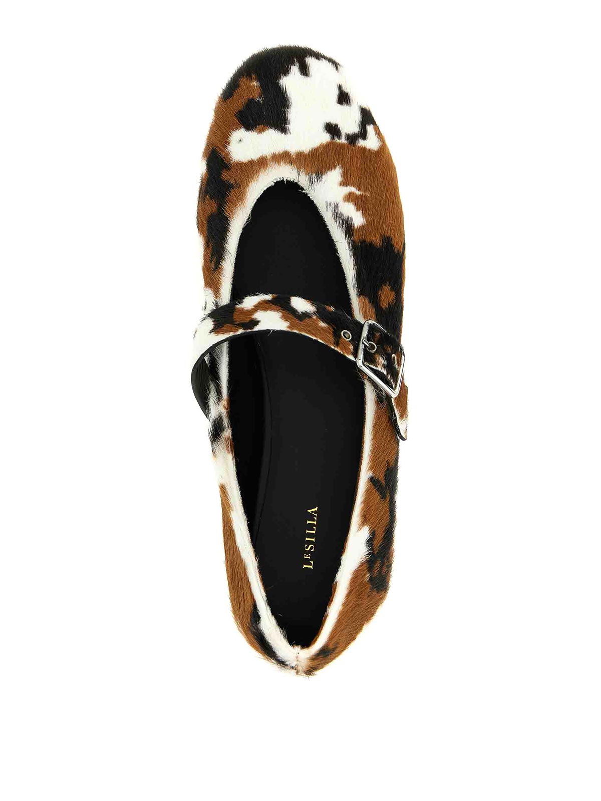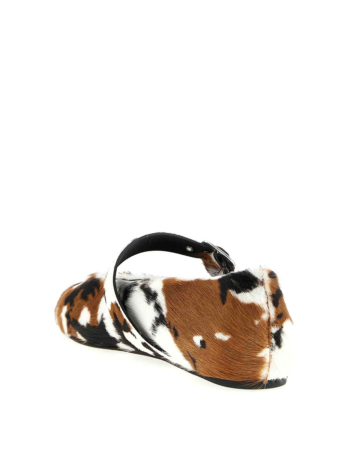 zapatillas de ballet de piel de cabra con estampado de vaca de danielle con correa ajustable en el empeine, punta redondeada y suela de plástico.