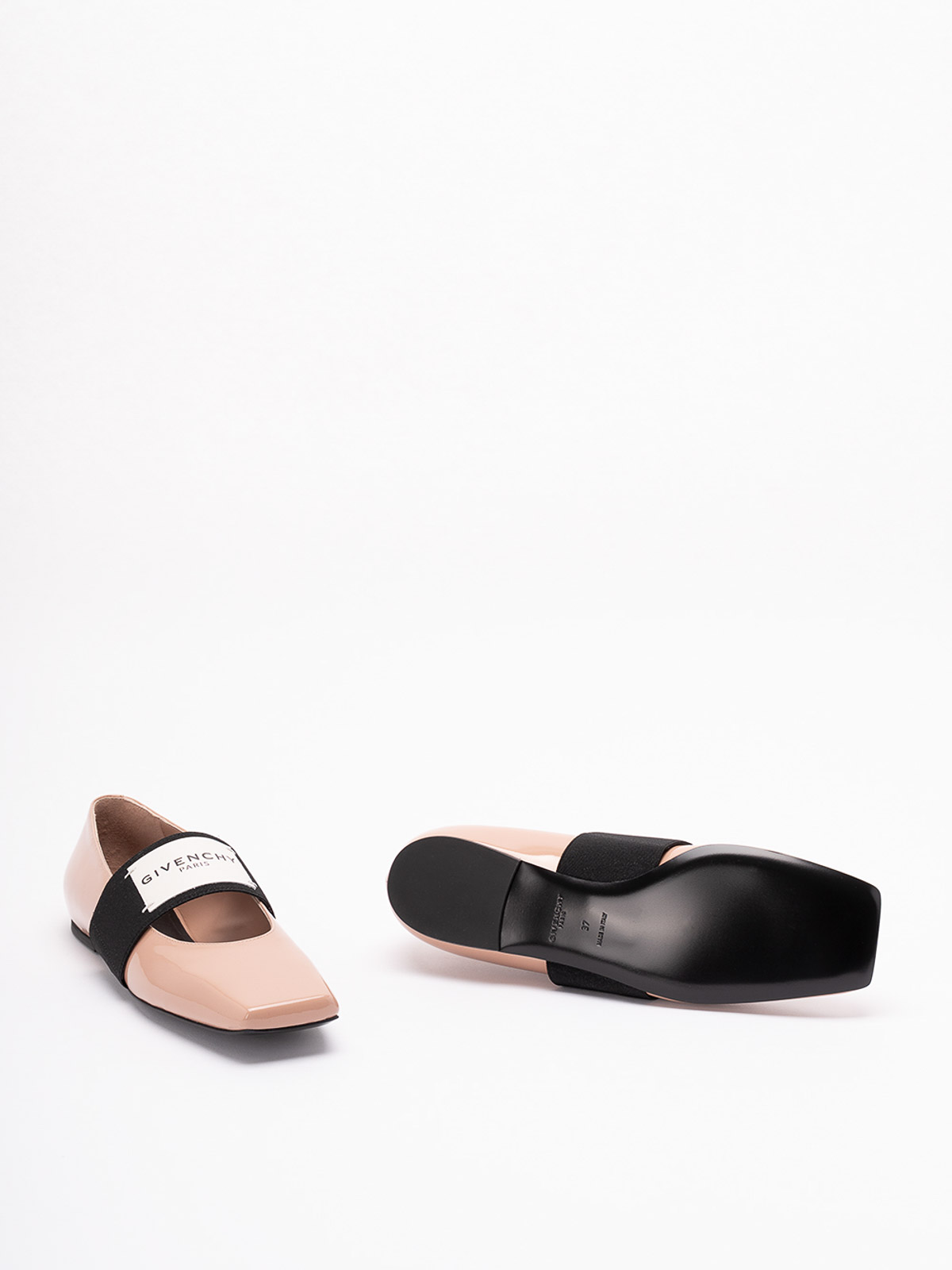 bailarinas planas de charol, línea cuadrada cortada, banda elástica con etiqueta de piel Givenchy Paris estampada, plantilla interna de piel con la firma Givenchy en relieve de Givenchy, punta cuadrada, modelo cómodo gracias a su construcción suave, etiqueta en tejido hidrófugo y lavable.