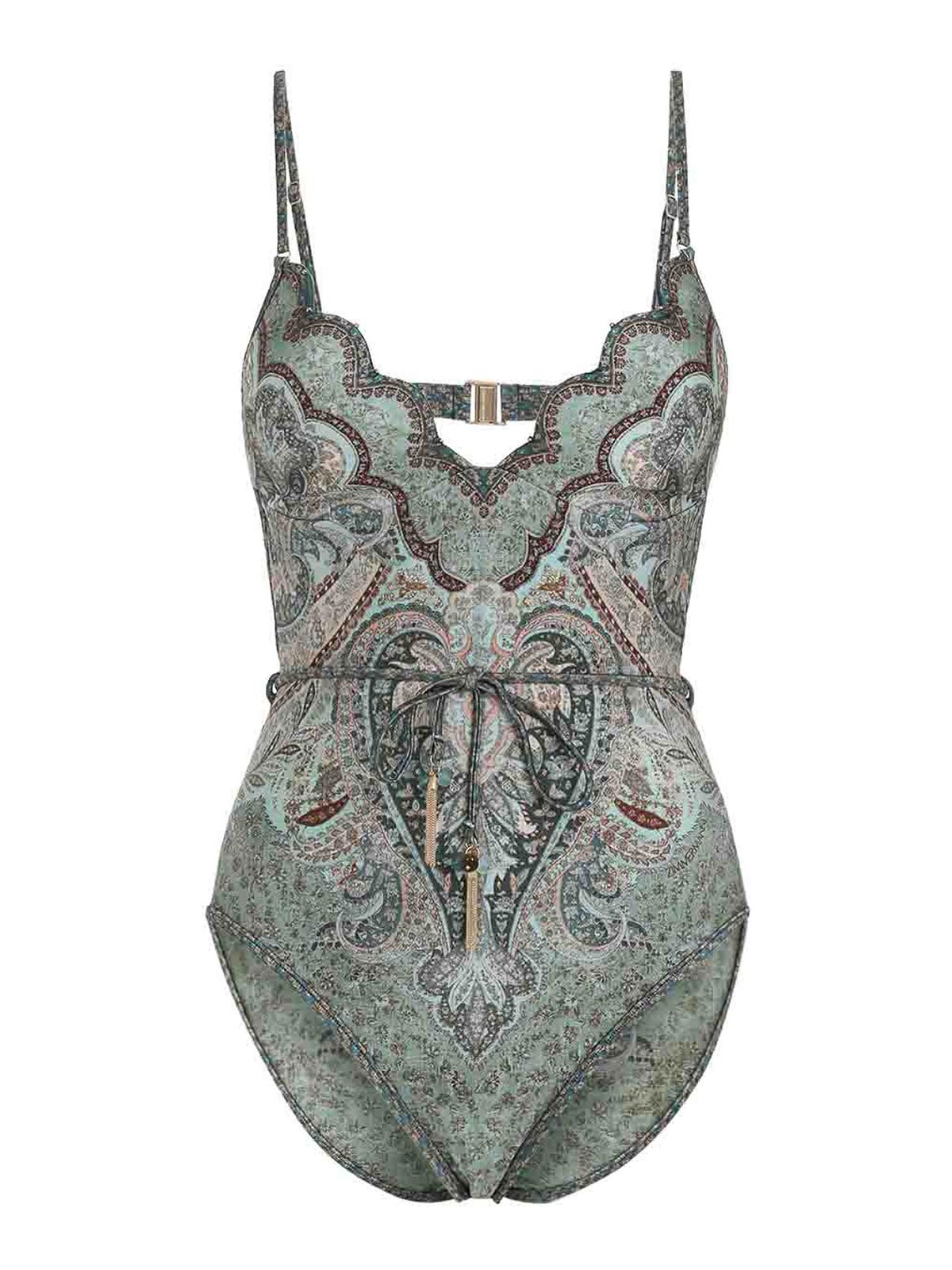 Bañador de una sola pieza de poliamida multicolor festoneado Zimmermann Wanderlust. Confeccionado en licra multicolor, estampado resort swim 2026 en todas partes, escote en V festoneado con ribetes de cuentas doradas, tirantes ajustables y desmontables, recorte en la espalda, cierre con broche en la espalda, minicurinto en la cintura, forrado.