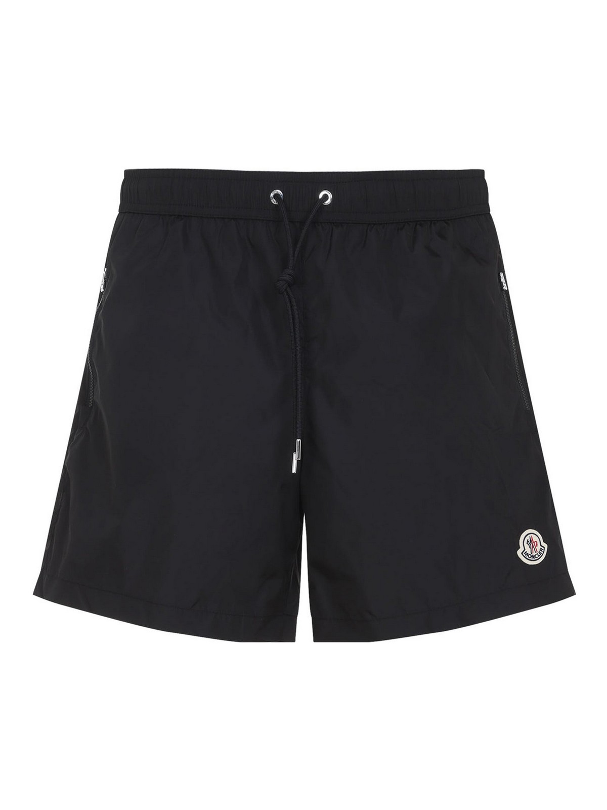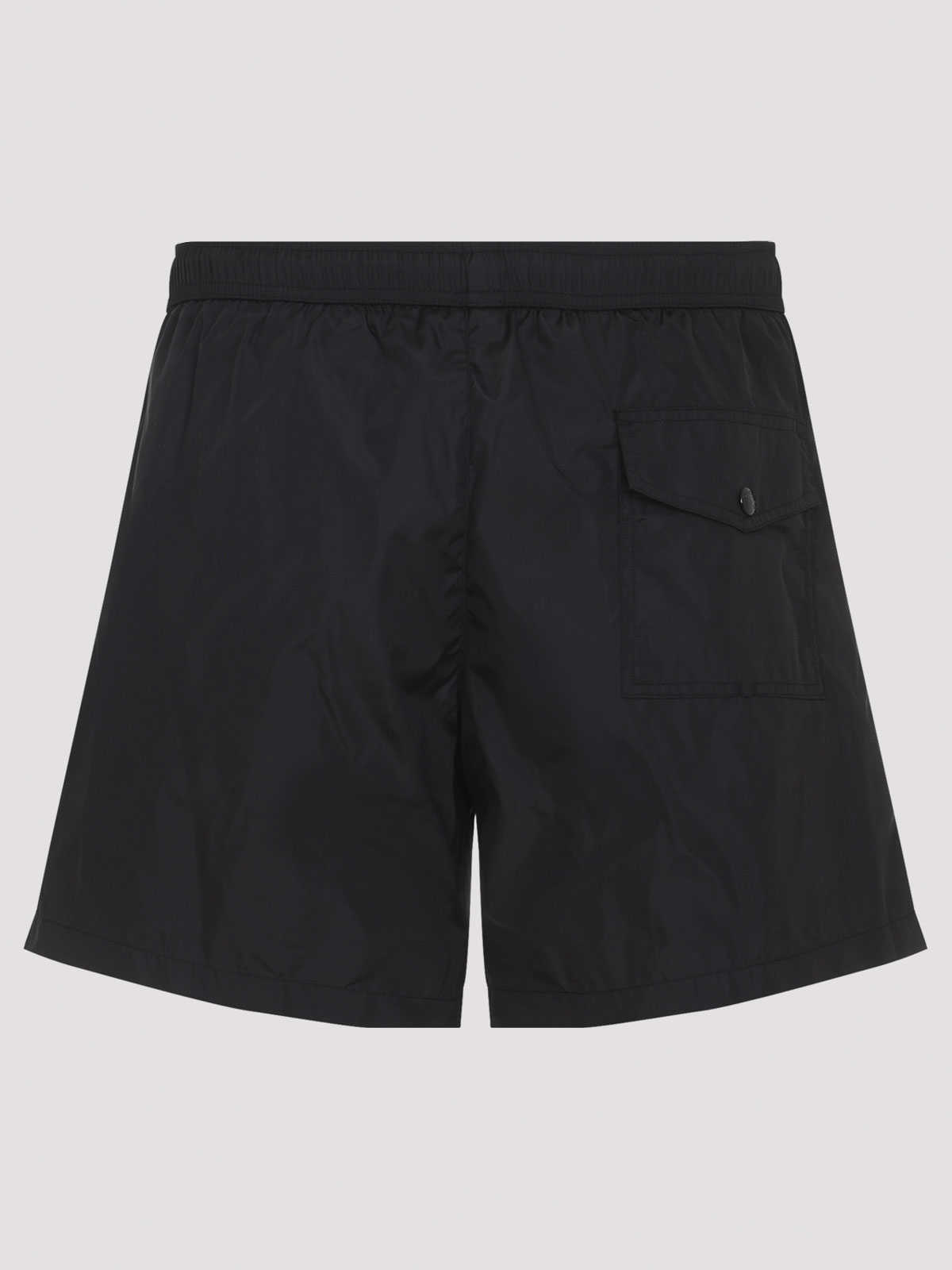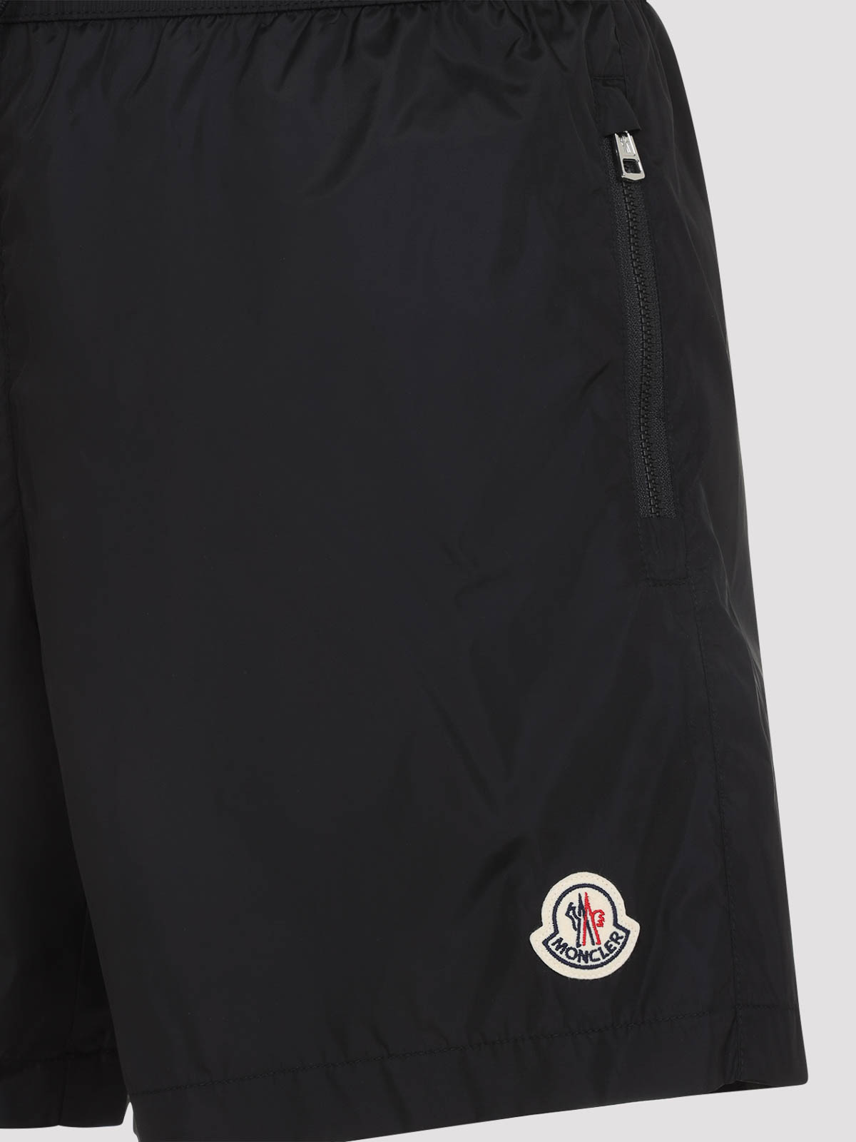 Traje de baño negro Moncler. Traje de baño de poliamida negra pura. Cintura elástica, detalles de cordón tonal en la parte delantera, bolsillos laterales con cremallera, bolsillo trasero con solapa y botón, logotipo de parche lateral, dobladillo recto.