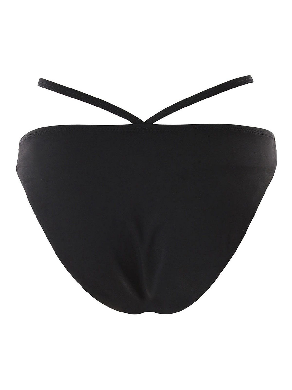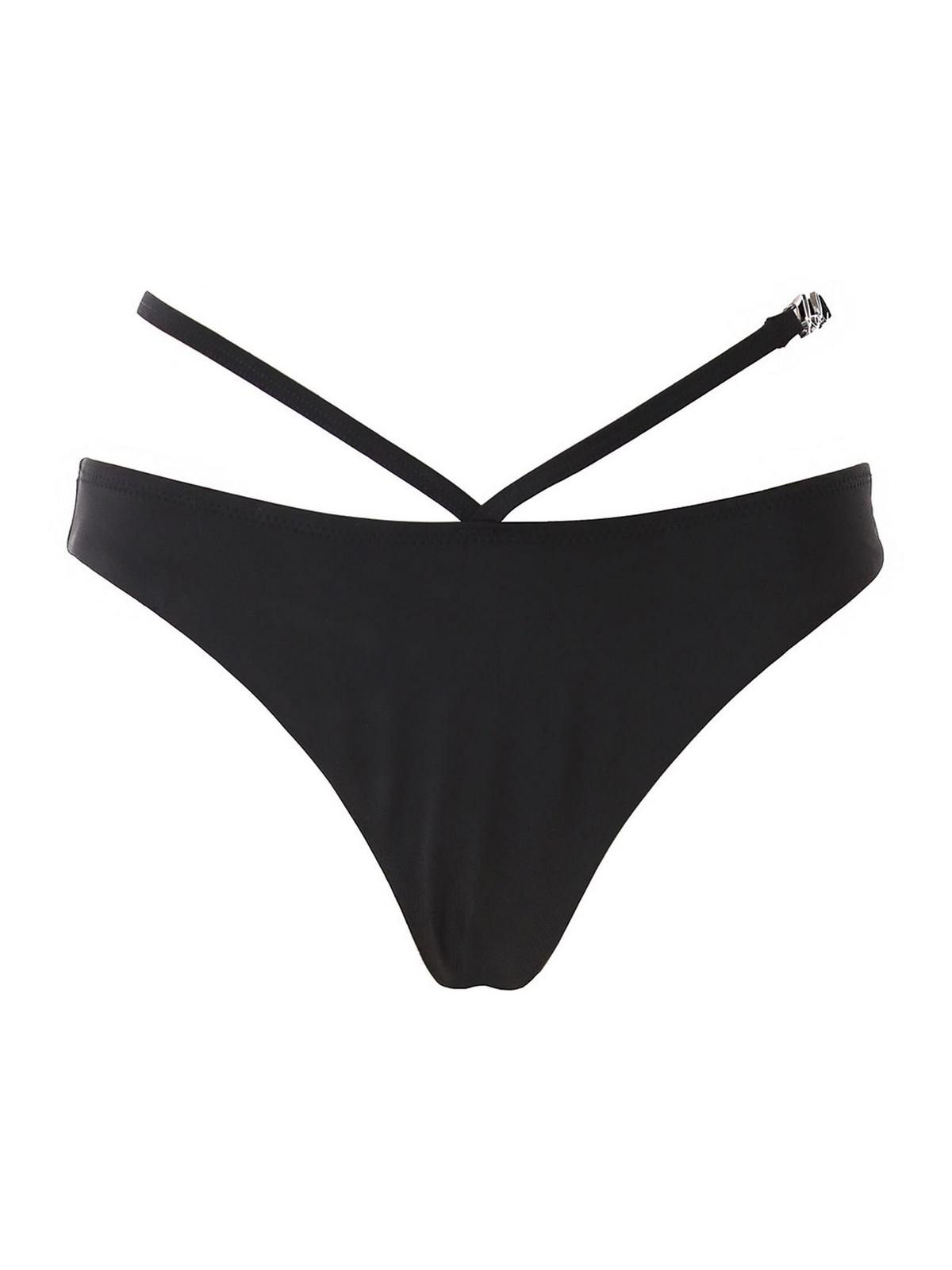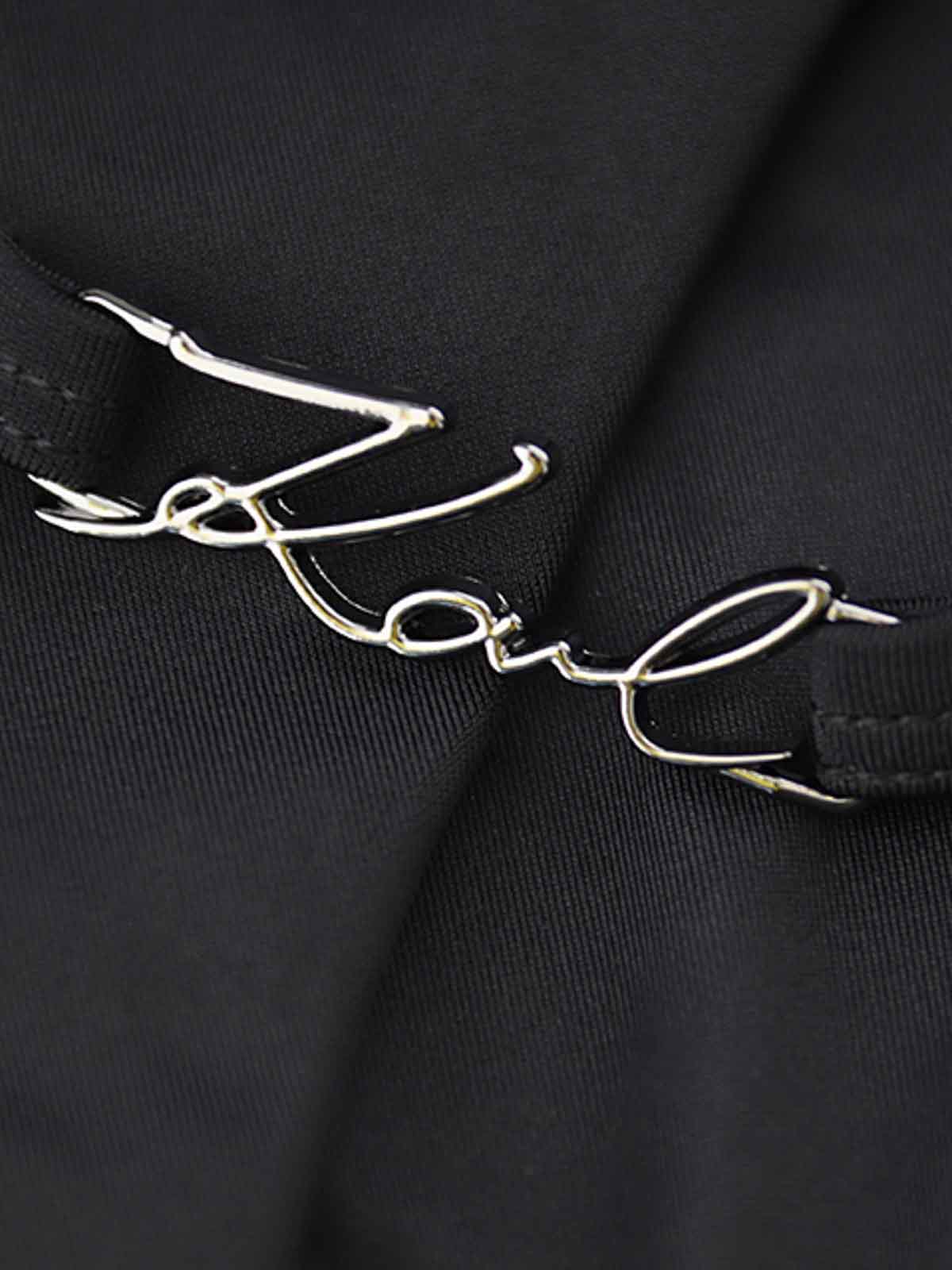 Calzoncillos de bikini con la firma de v karl en negro calzoncillos de bikini para mediana edad hechos reciclados, caracterizados por los cordones en V de cintura alta con el amuleto característico de karl en metal brillante, parte superior combinada, calzoncillos de bikini asimétricos y coordinados, de mediana duración con cintura en V de talle alto, velo en metal Karl Signature, color negro, color negro