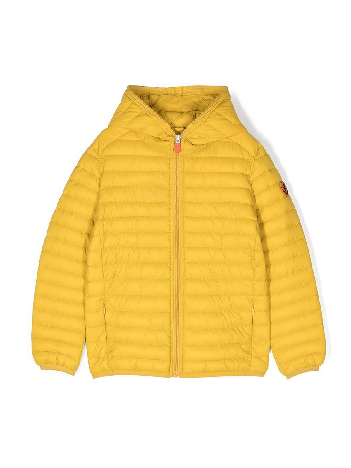 Chaqueta con capucha y mangas con parche con el logotipo de Save the Duck Kids con parche con el logotipo en la manga, dos bolsillos traseros con cierre de cremallera, diseño acolchado amarillo sol, capucha clásica, cierre con cremallera en la parte delantera y manga larga, talla años
