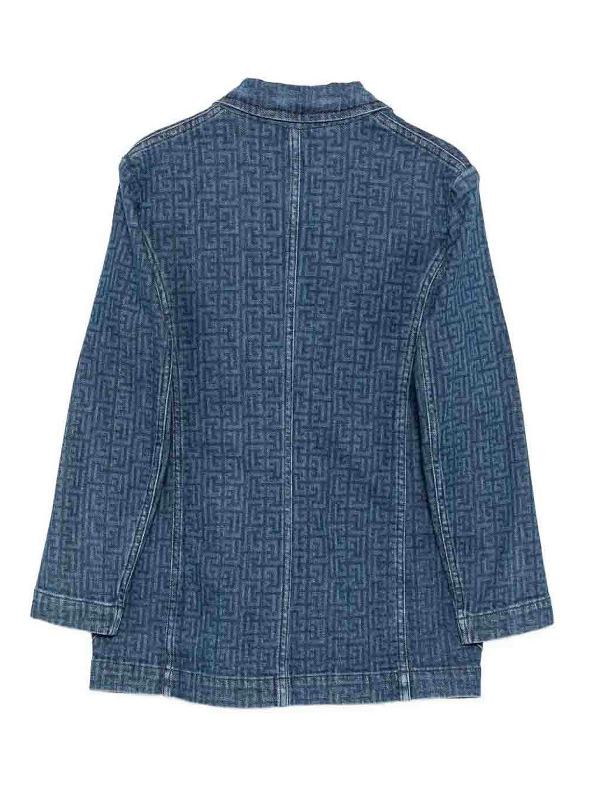 Blazer vaquero cruzado con logo índigo y botones, bolsillo ribeteado en el pecho, dos bolsillos de parche en la parte delantera