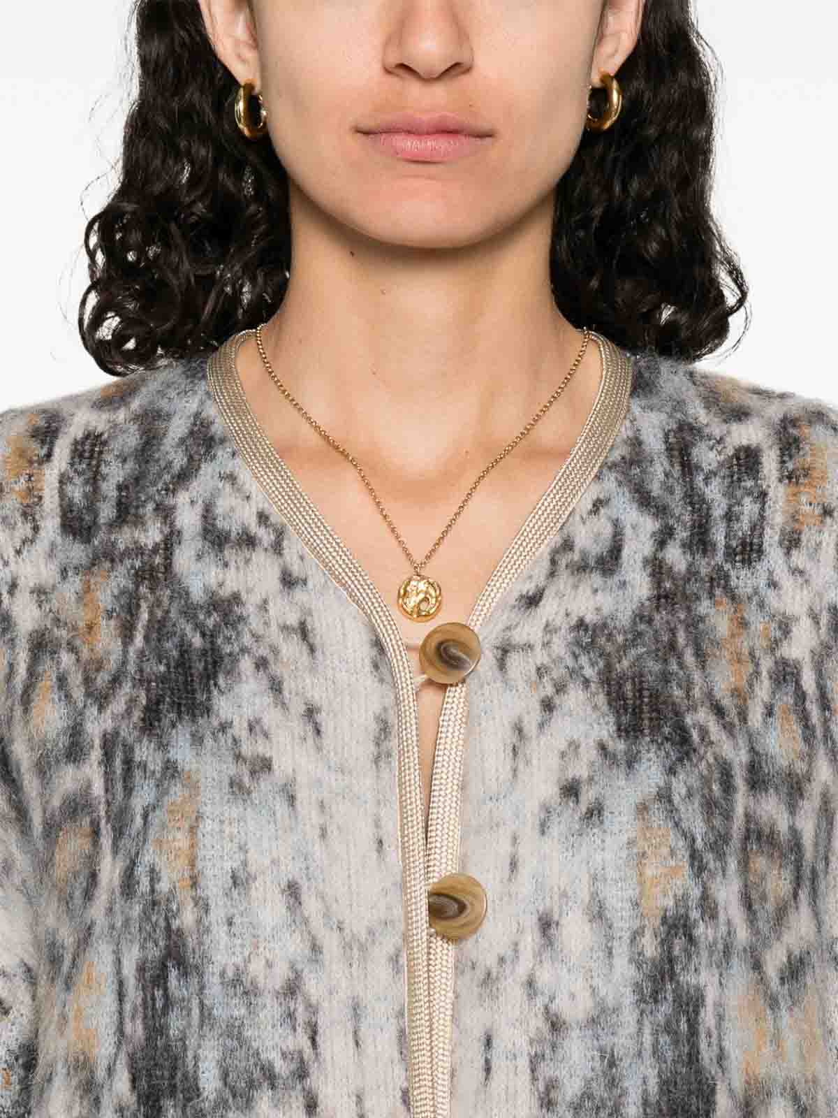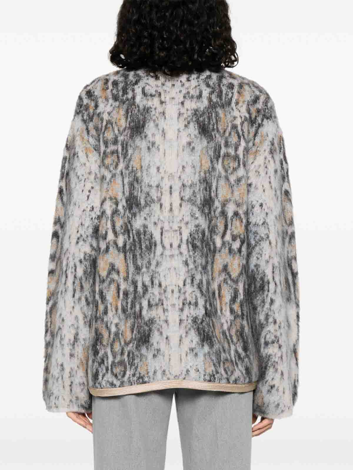Cierre con botones en la parte delantera gris claro, cuello en V, mangas largas, dobladillo curvo