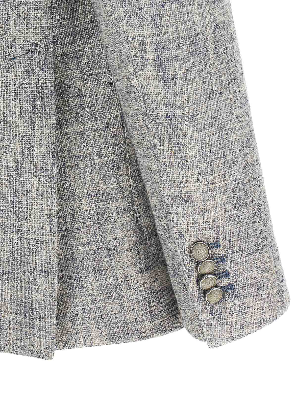 Blazer montecarlo de un solo pecho confeccionado en mezcla de viscosa, algodón y lino con cierre con botones en la parte delantera, solapas en visera con alfiler metálico extraíble, bolsillo en el pecho, bolsillos de parche, sin forro, tres bolsillos interiores, puños con ojales abiertos y aberturas en la espalda.