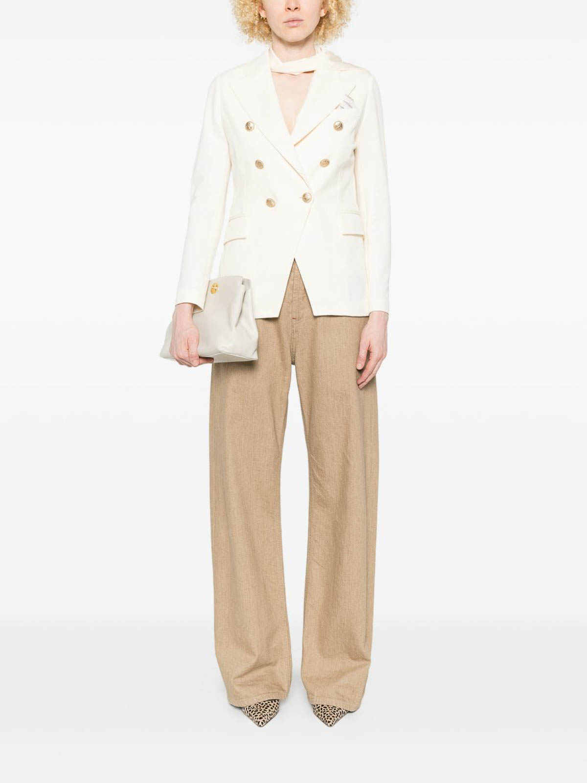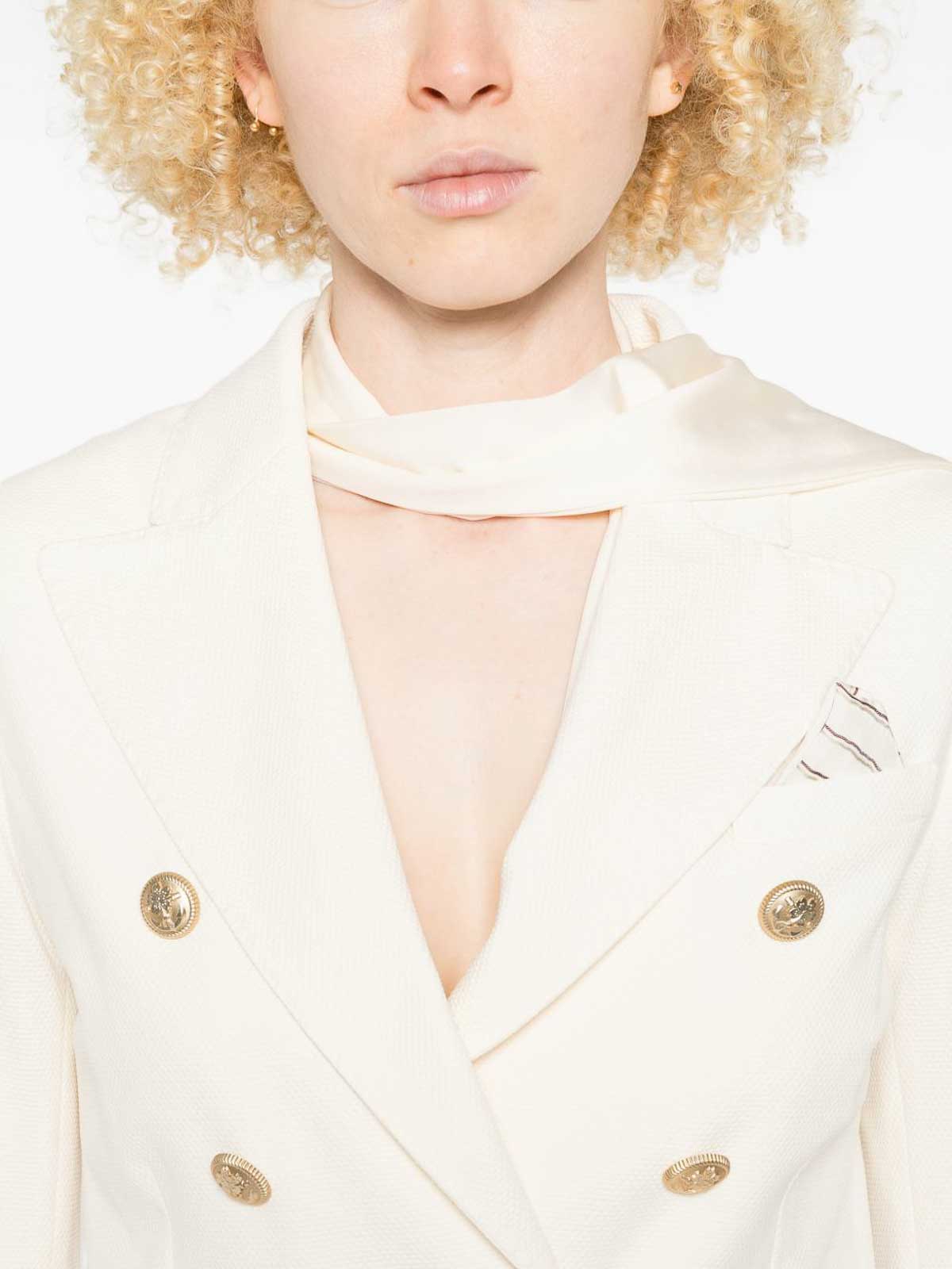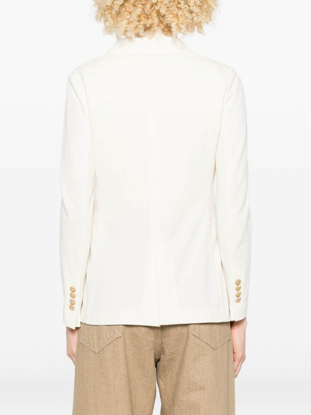 Botones blancos con doble botonadura en tono dorado, solapas con muescas, bolsillos con solapa