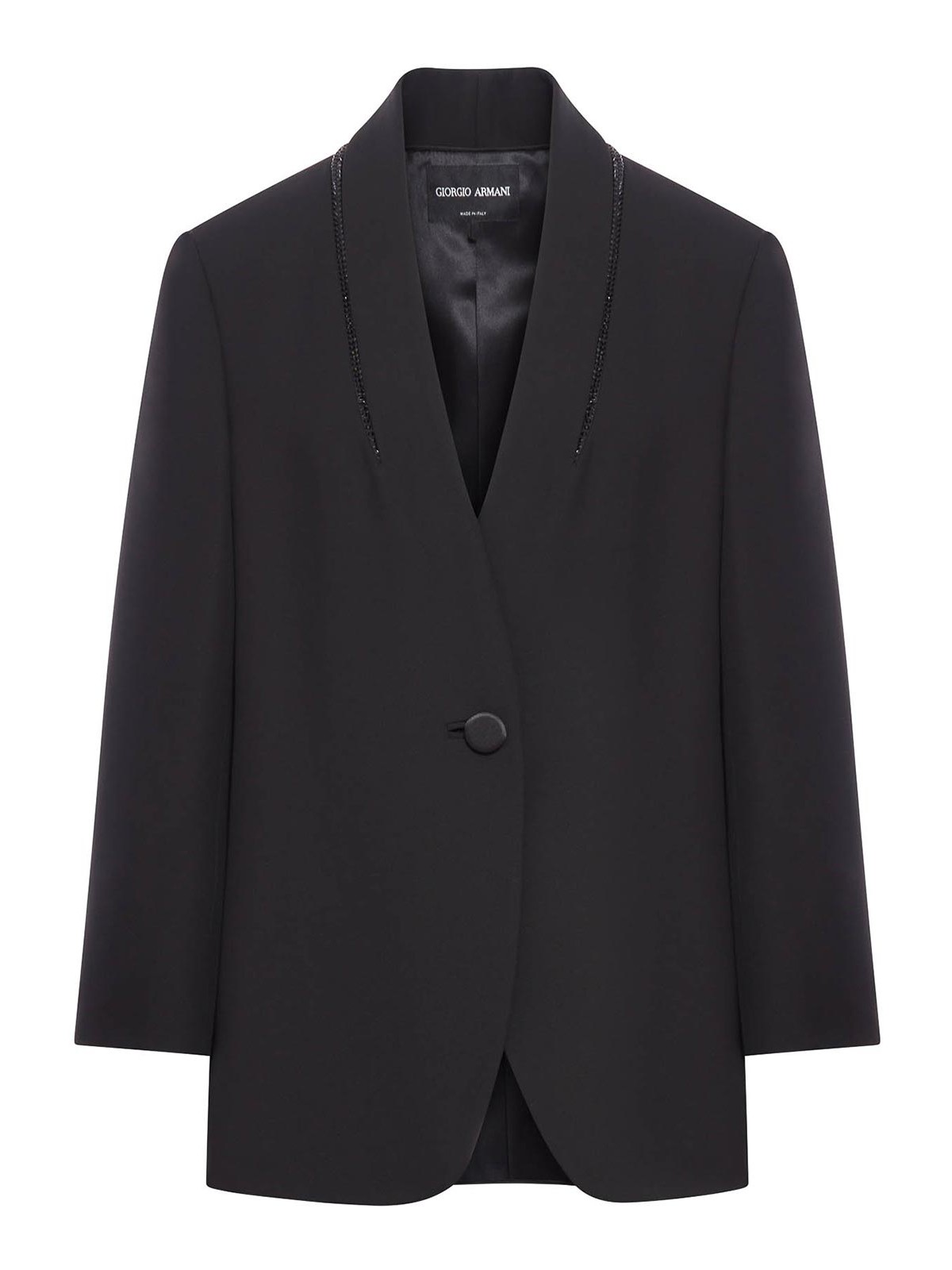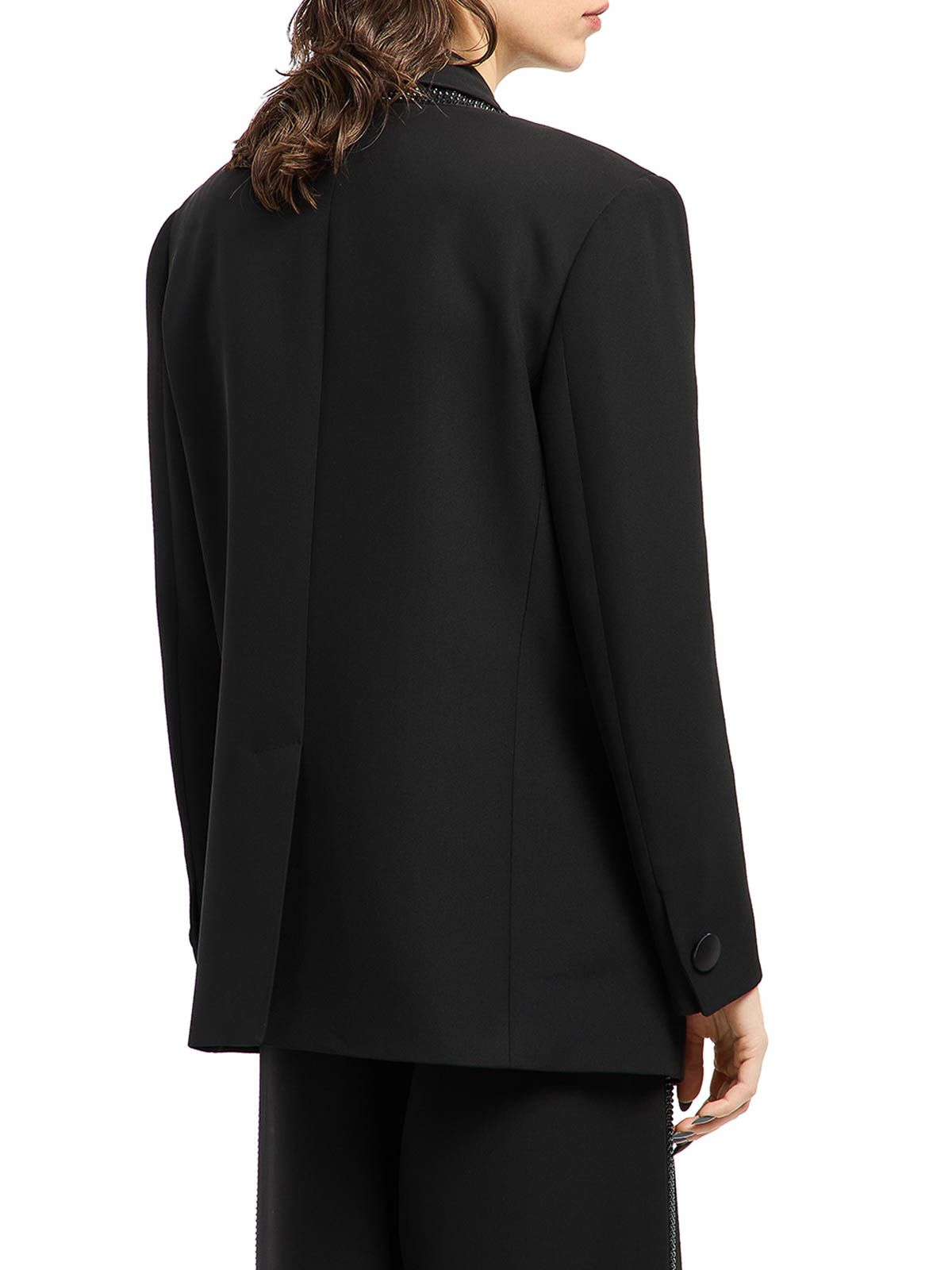 Chaqueta individual, botonada, cuello con solapa tipo chal, termo negro, ribete adhesivo, individual, botonada con un botón cubierto, dos bolsillos ribeteados verticales, botón cubierto en el puño, mangas de reloj, forradas, color negro