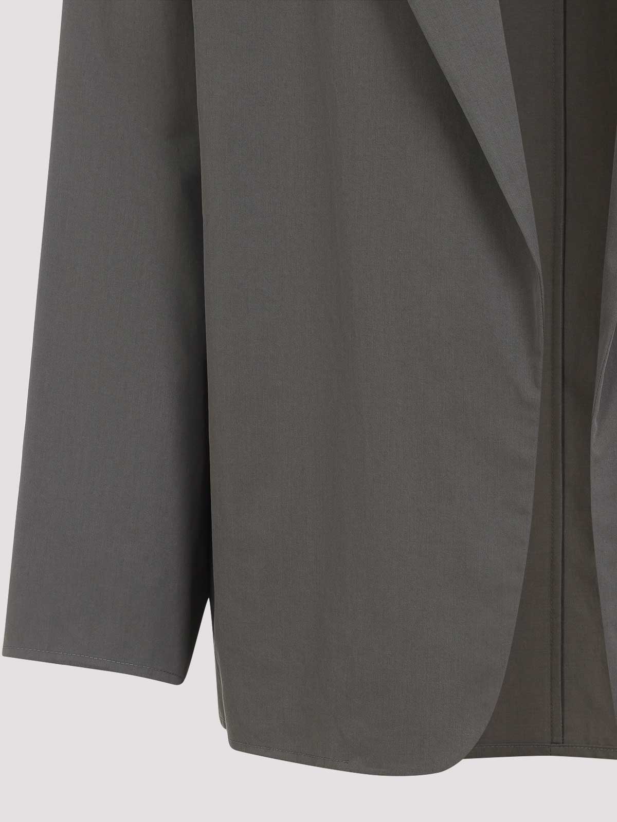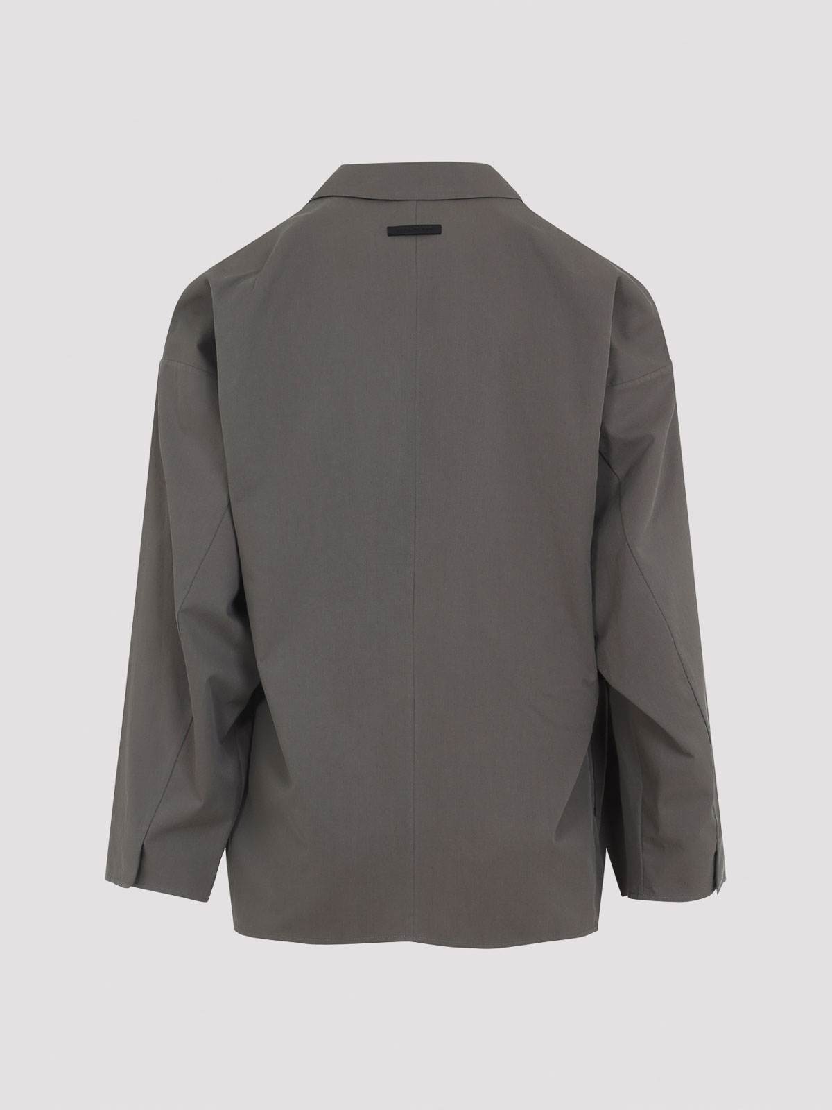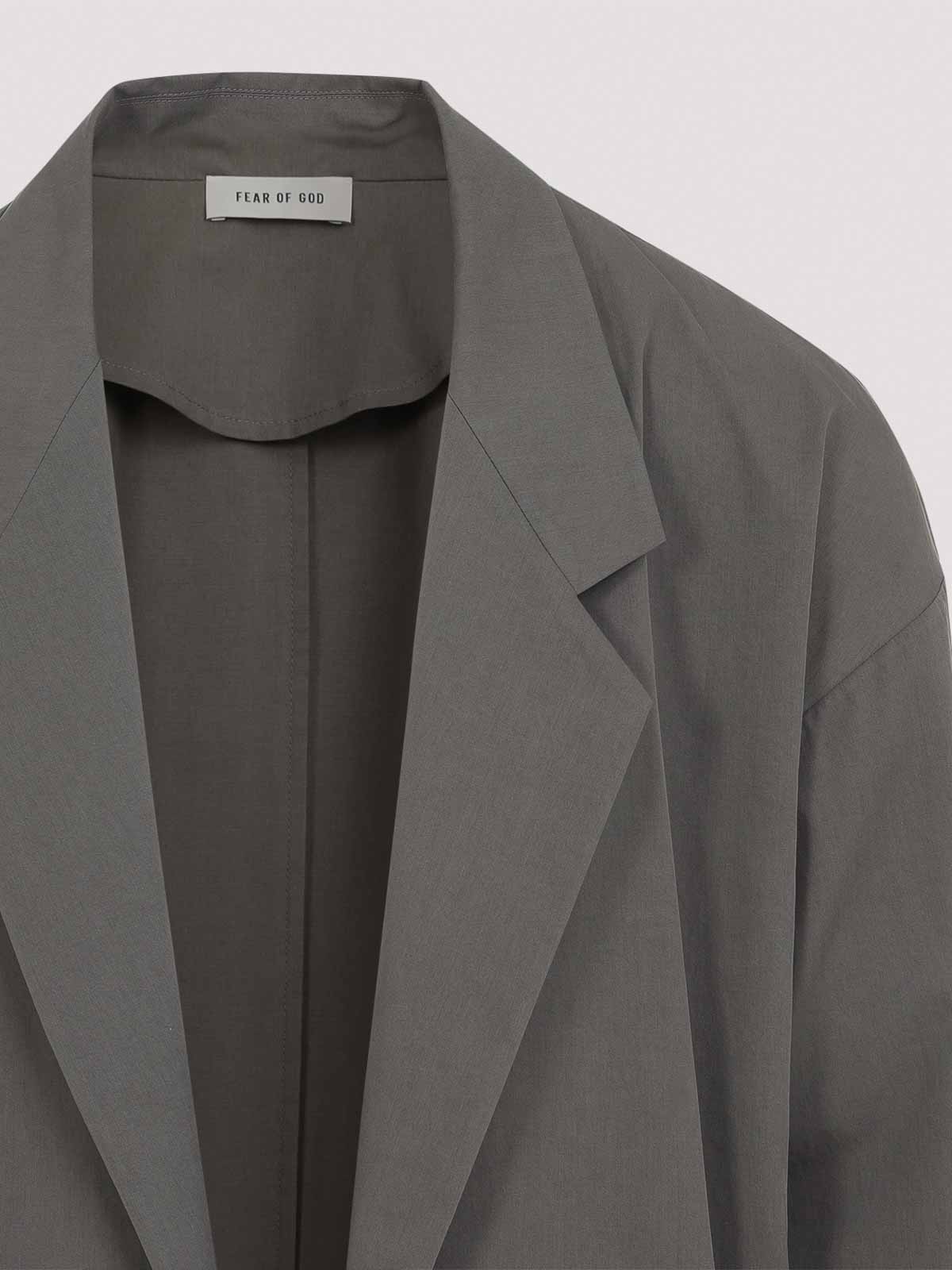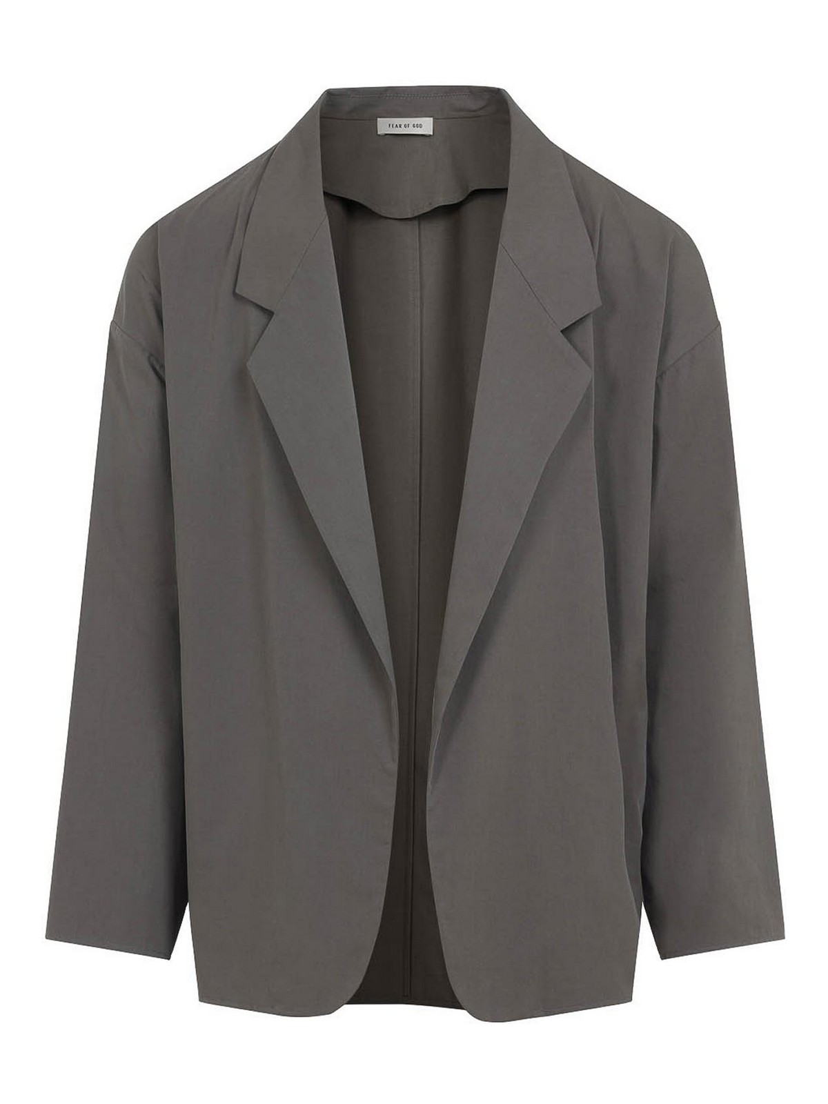 Blazer californiano sin forro de Fear of God, gris sauce, confeccionado y mezclado, cuello con muescas, hombros caídos, mangas largas, parche en la espalda, logotipo, dobladillo redondo