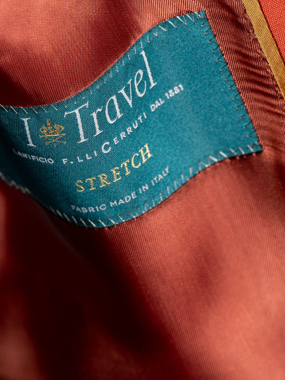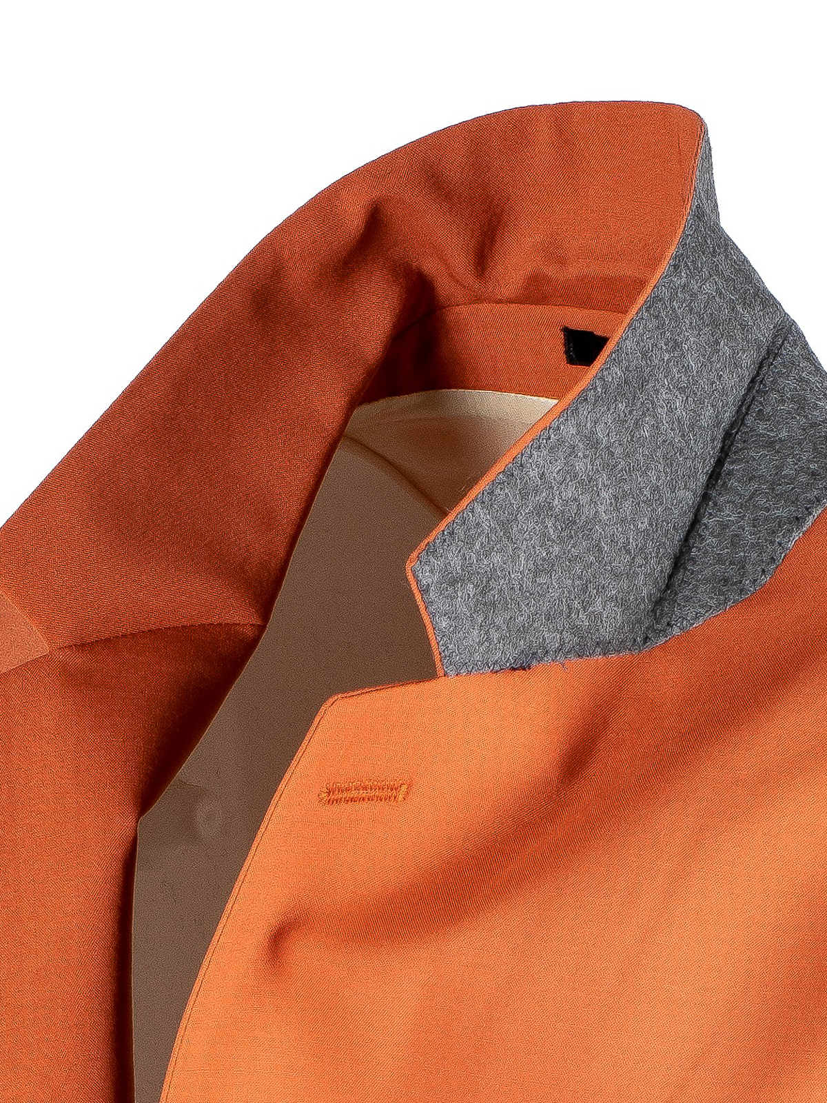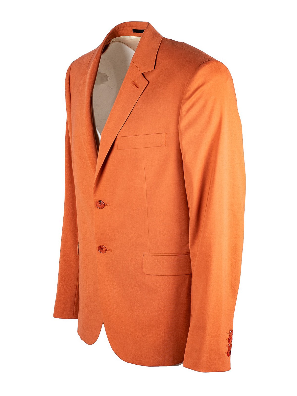 Blazer ajustado de lana elástica en color naranja, confeccionado con un tejido ligero de lana elástica «viaje», este blazer naranja vibrante presenta un forro de cupro y botones de bocina teñidos a juego.