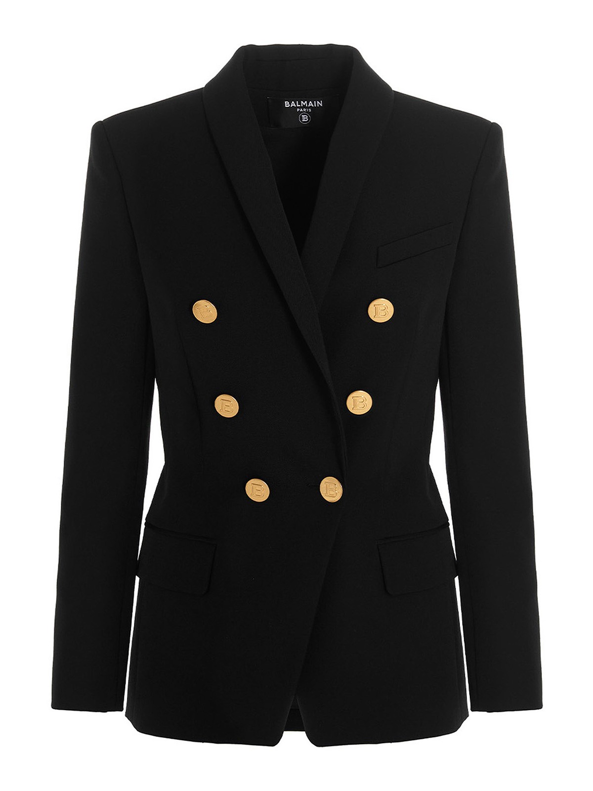 Chaqueta tipo blazer de lana de doble pecho con botones dorados con logotipo, hombreras y mangas largas.