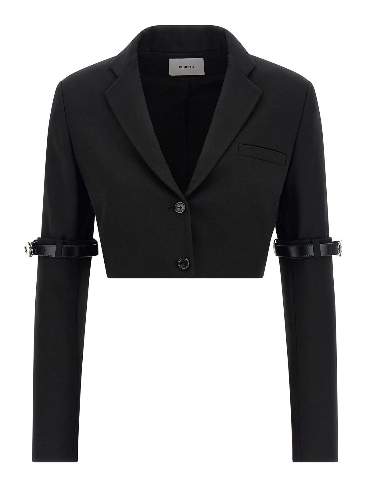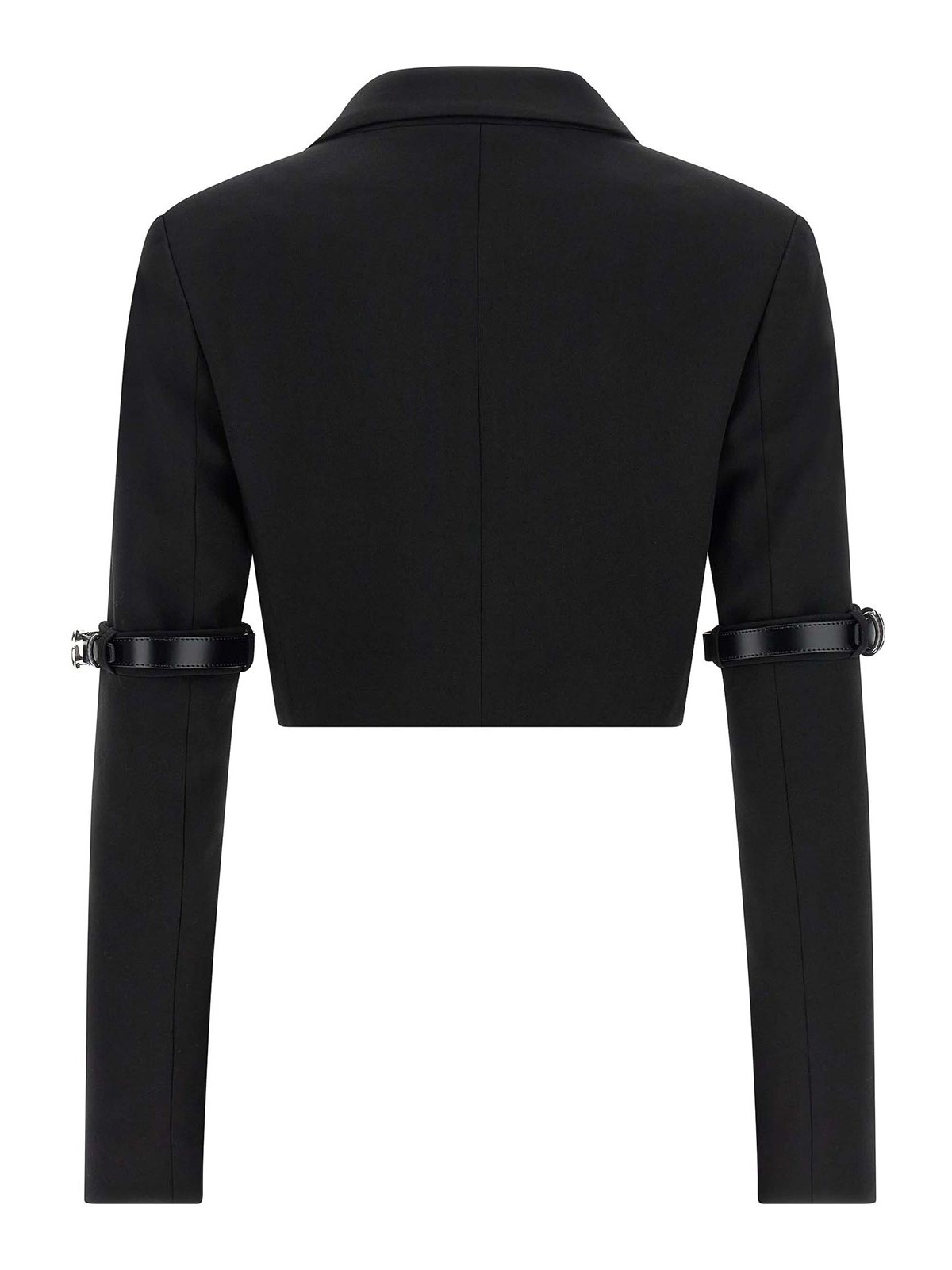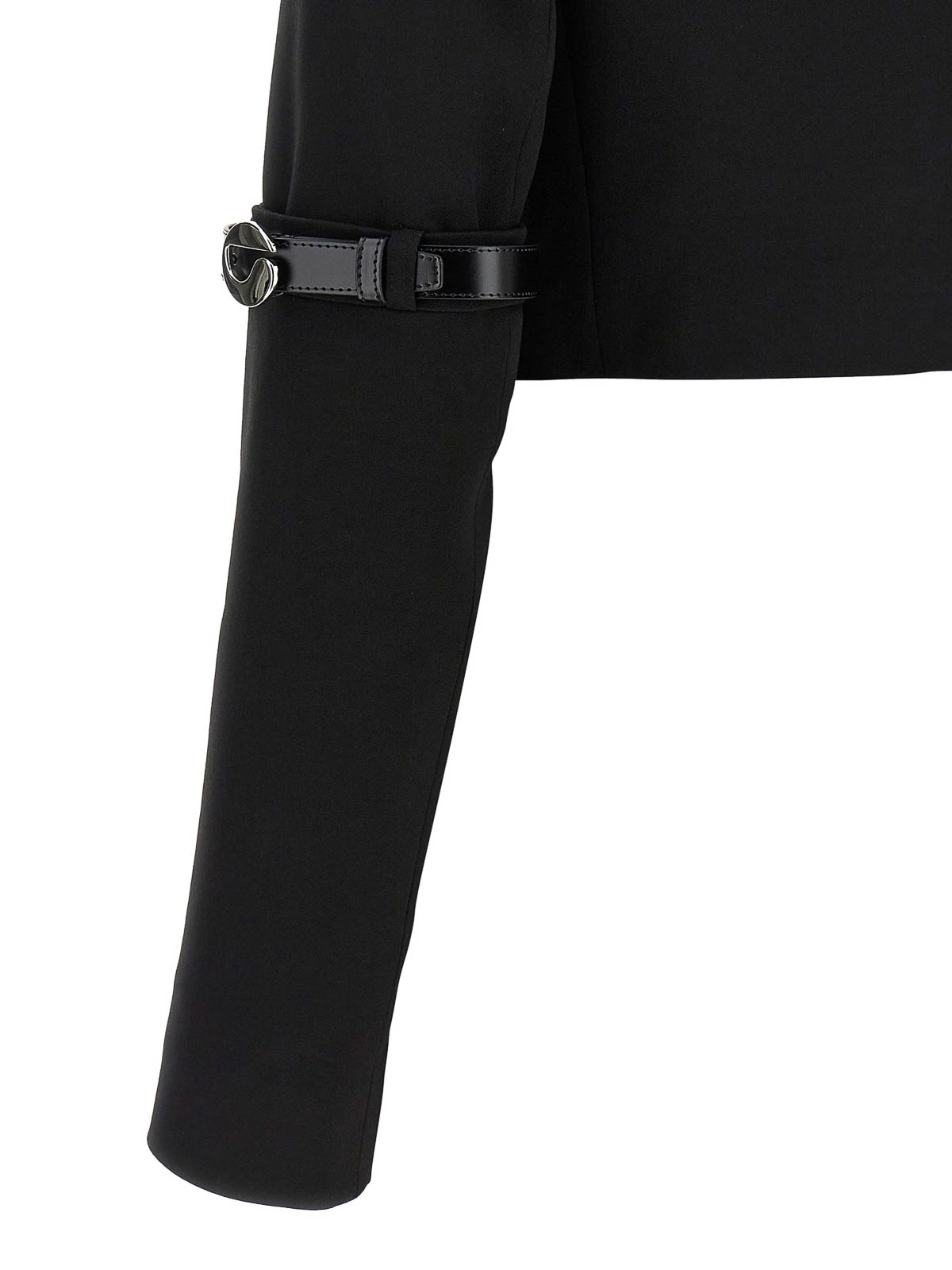 blazer bolero híbrido de botonadura única en mezcla de viscosa y lana virgen con cierre con botones en la parte delantera, solapas espejadas, bolsillo en el pecho, correa de hombro estructurada, mangas largas con detalle de correa de piel con hebilla metálica con el logotipo, forro en mezcla de viscosa y cupro.