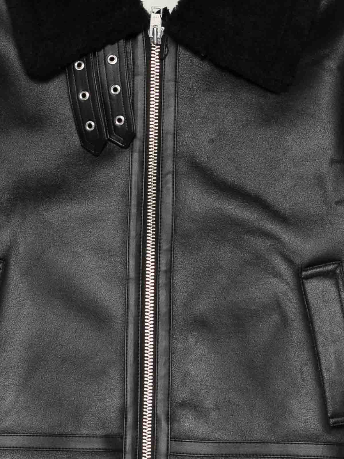 Ribete de piel sintética negra, herrajes plateados, cierre frontal con cremallera, detalle de hebilla, cuello con cierre a presión