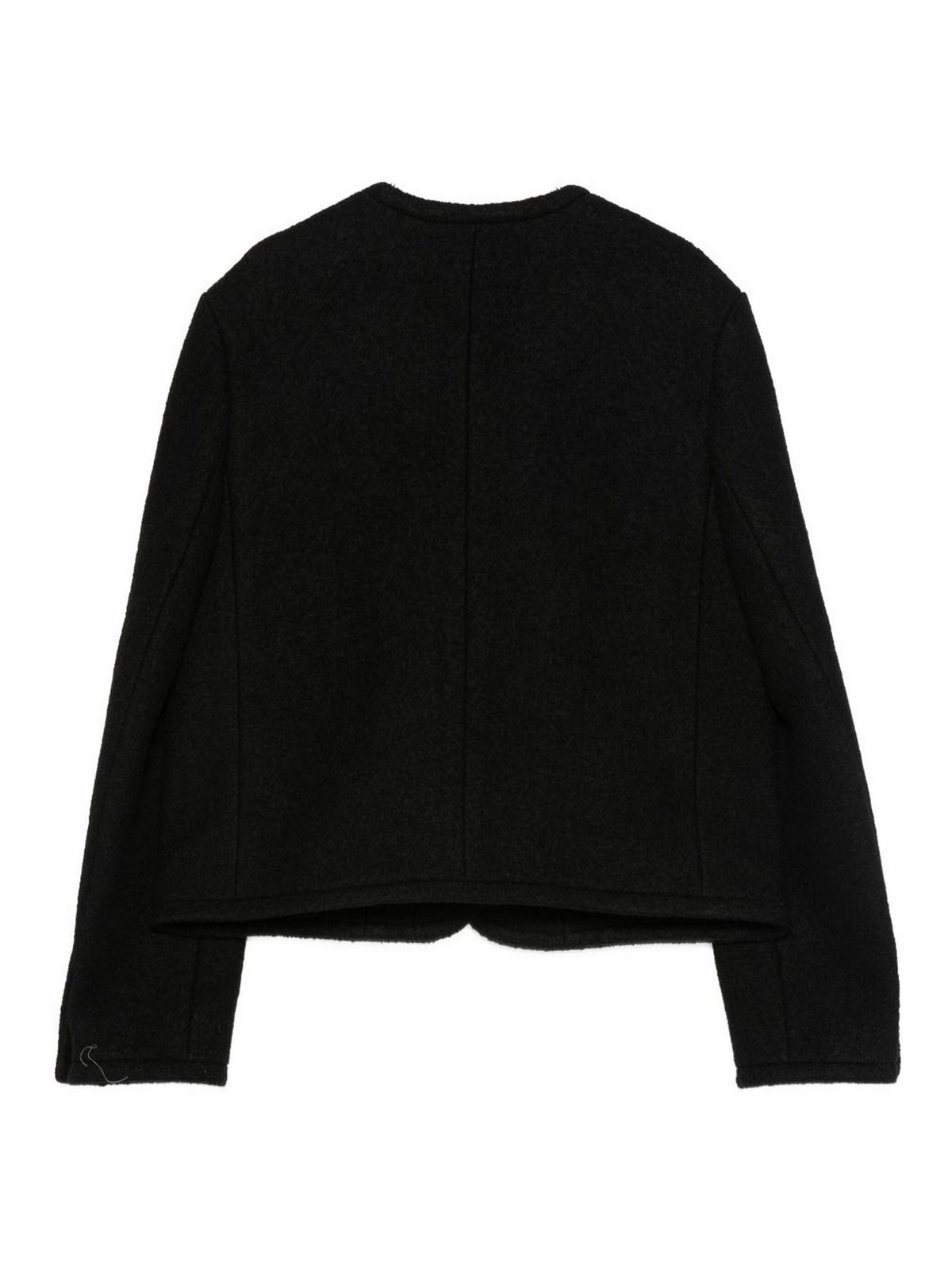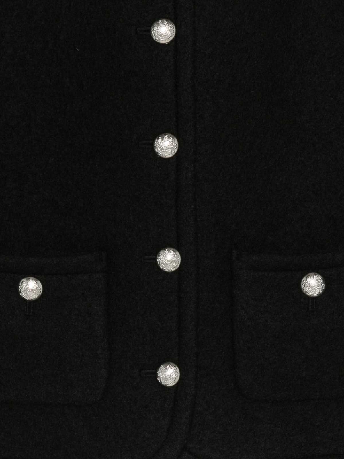 Botones de perla negra, bolsillos de parche, cuello redondo, manga larga, cierre con botones