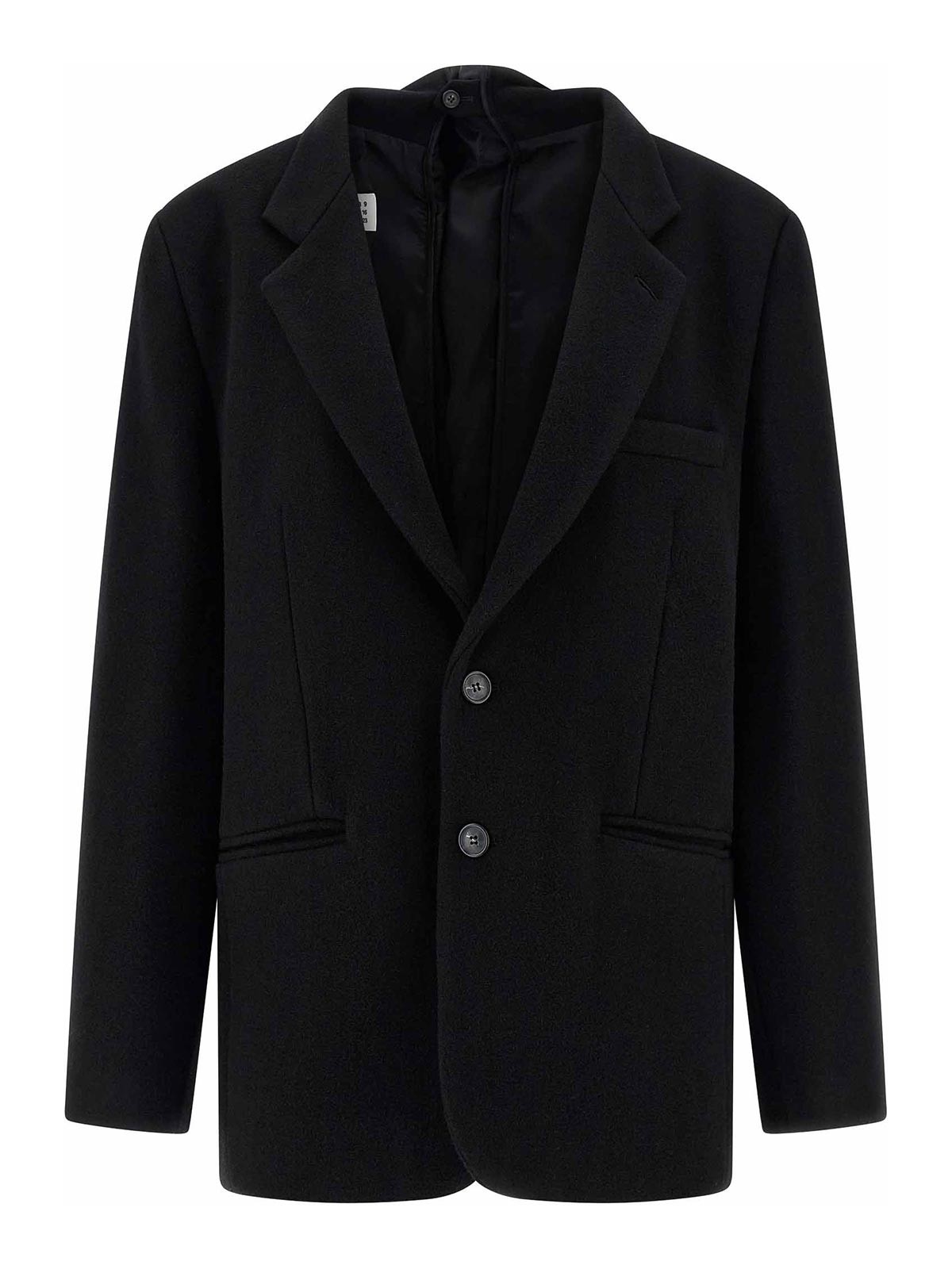 Blazer de lana de un solo pecho con cierre de botones en la parte delantera, solapas con espejo, bolsillo en el pecho, bolsillos de parche, correa de hombro extra acolchada, manga larga, panel posterior de tela tono sobre tono para ajustar el ancho y «línea de punto blanco» en la parte posterior.