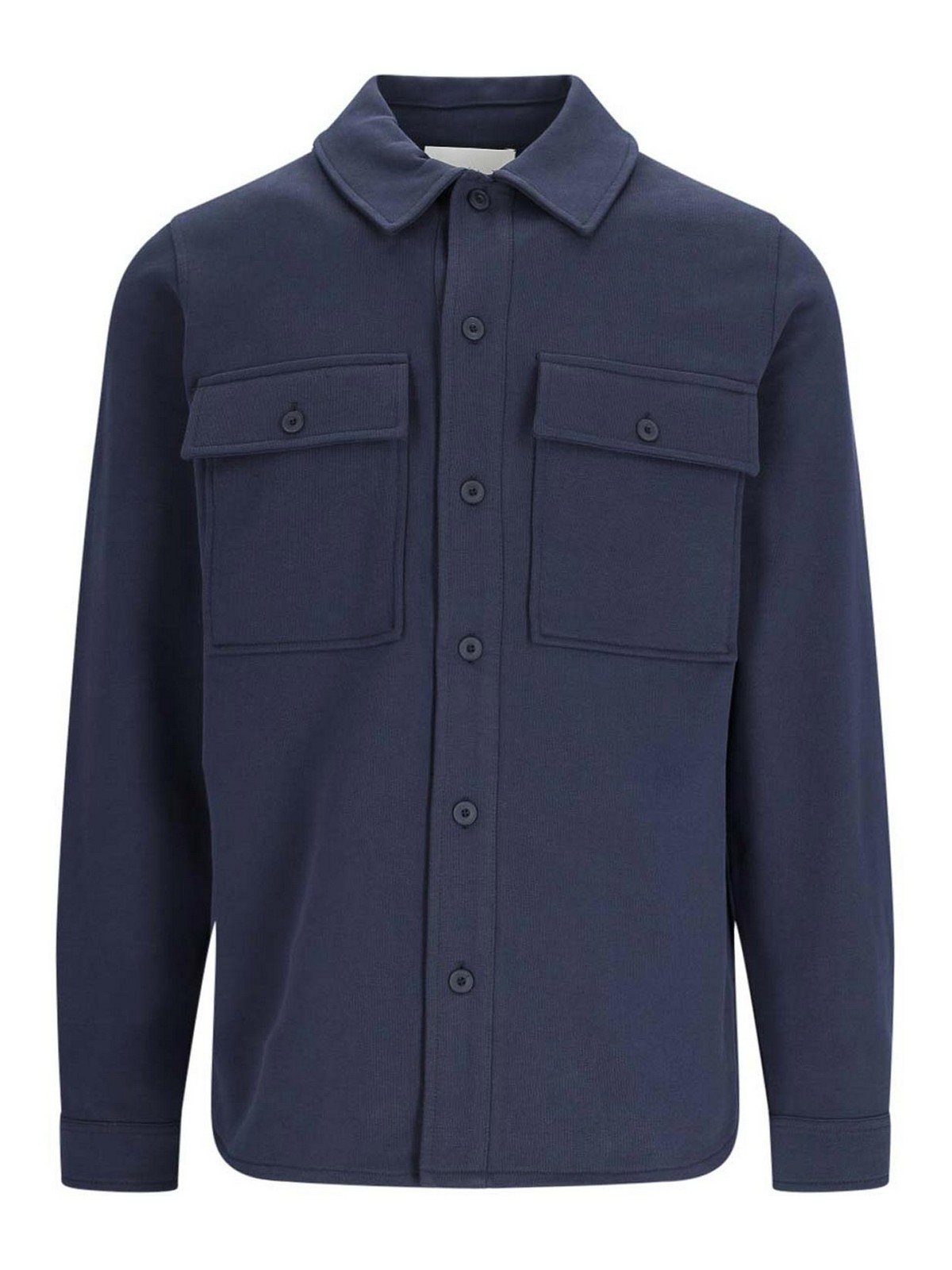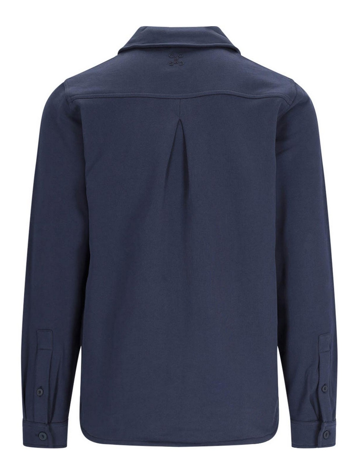 Camisa utilitaria azul cerrada, cuello clásico, botones, dos bolsillos, solapa, botones en la parte delantera, puños, logotipo en relieve, dobladillo curvo en la parte trasera