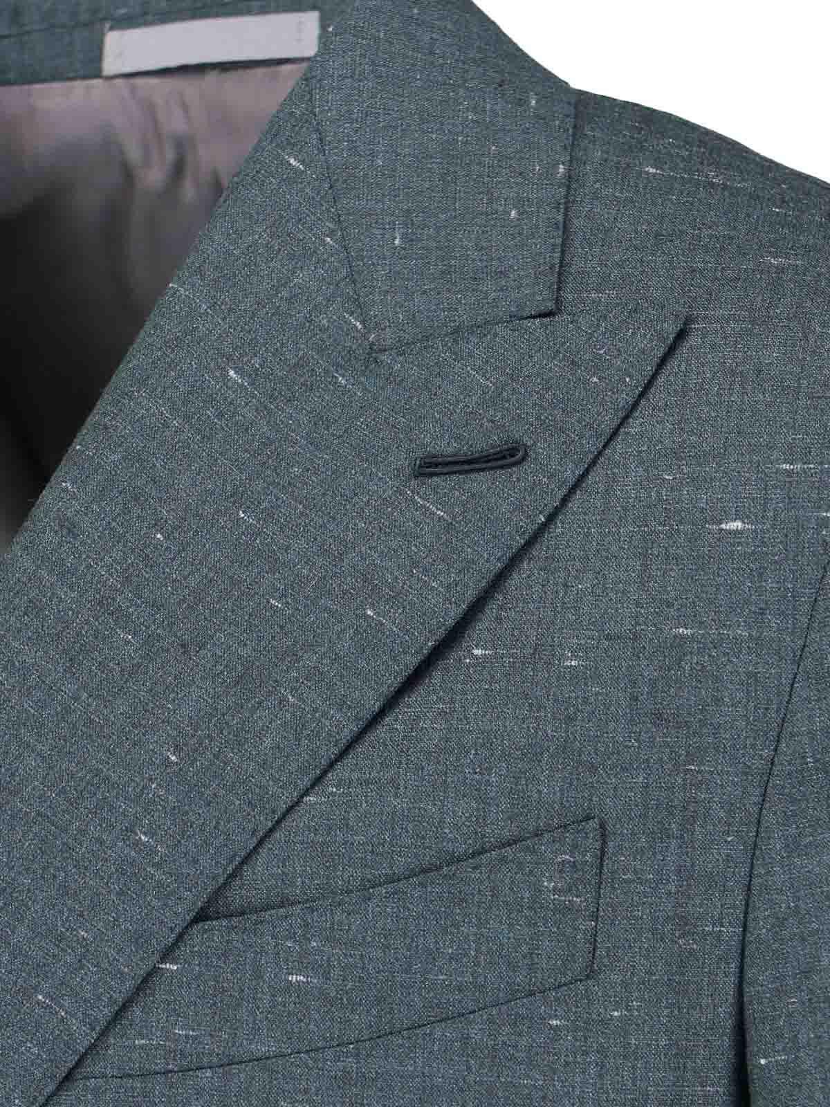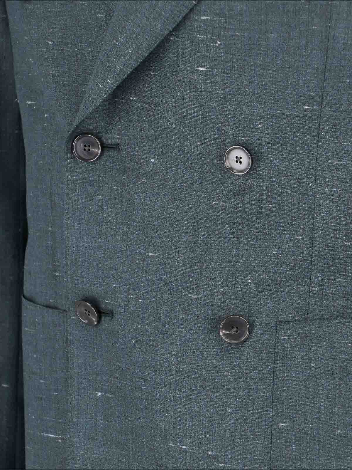 Blazer cruzado Caruso de seda y lana verde, solapas, manga larga, cierre frontal con doble botonadura, dos bolsillos delanteros.