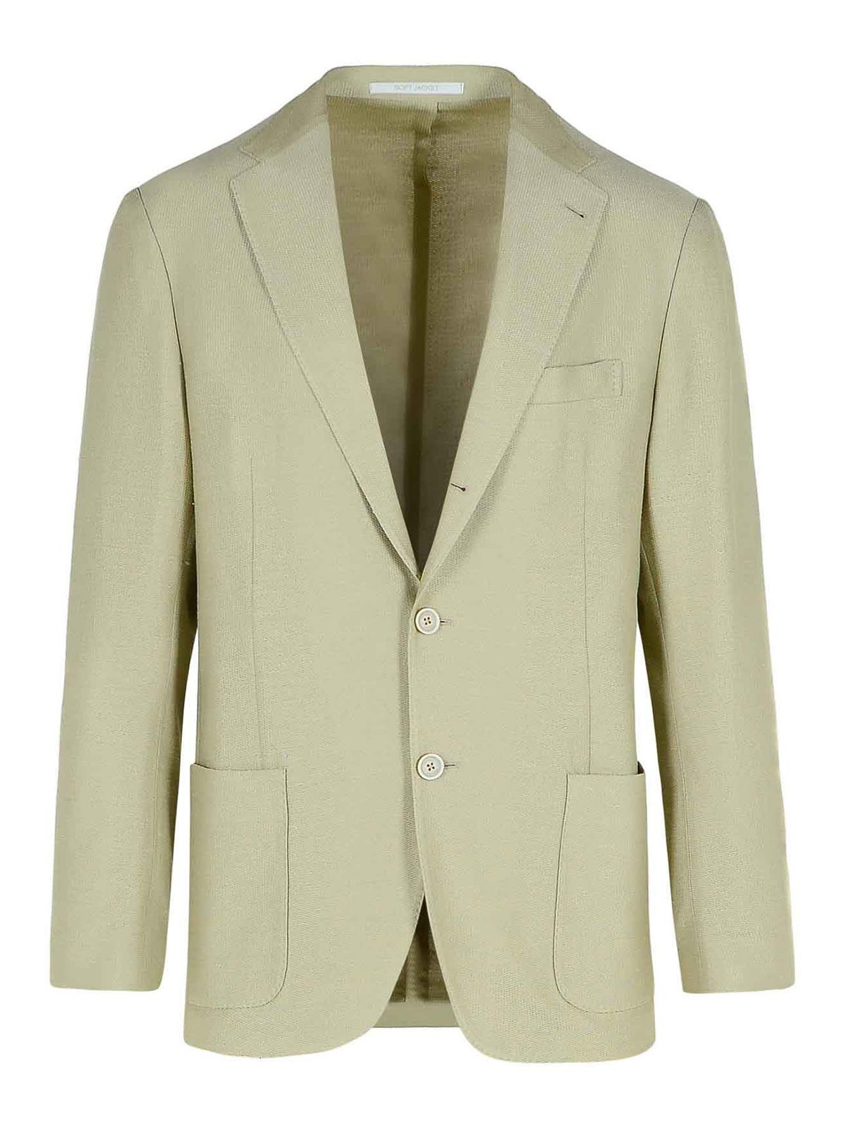 escote en V, cierre con botones cruzados, ribete tonal, tres bolsillos frontales, aberturas laterales en la parte posterior del dobladillo