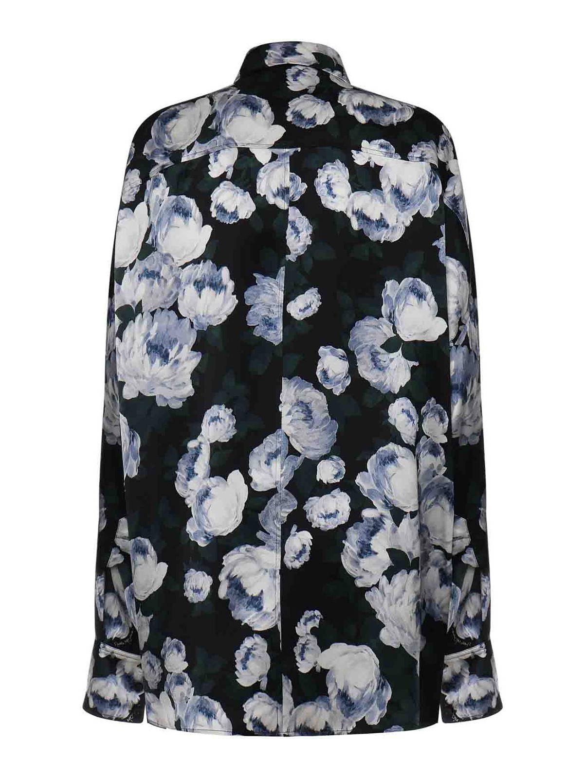 hecho de satén, cierre con botones en la parte delantera, mangas largas y voluminosas, cuello puntiagudo, la talla que se muestra es 38, color del diseñador: multicolor