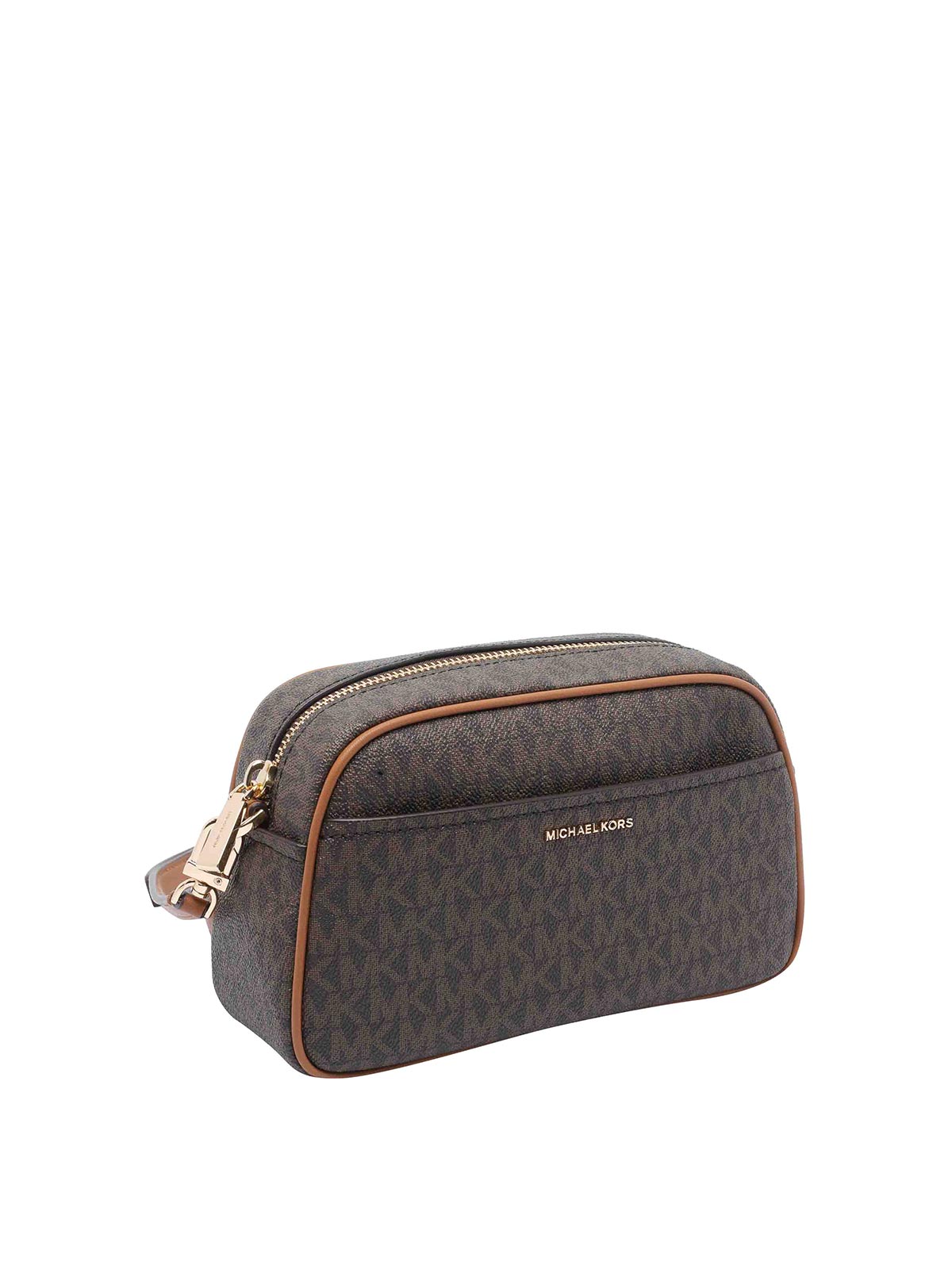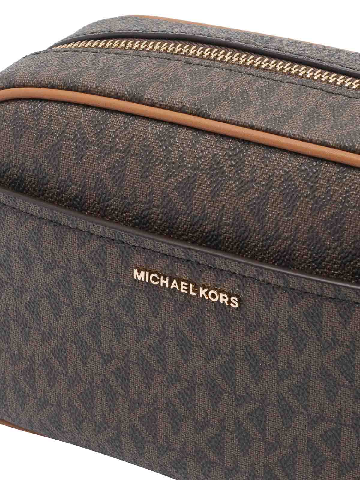 Bolso bandolera pequeño jet set de Michael Michael Kors, marrón, bolsillo con cremallera, correa extraíble, minilogotipo frontal,