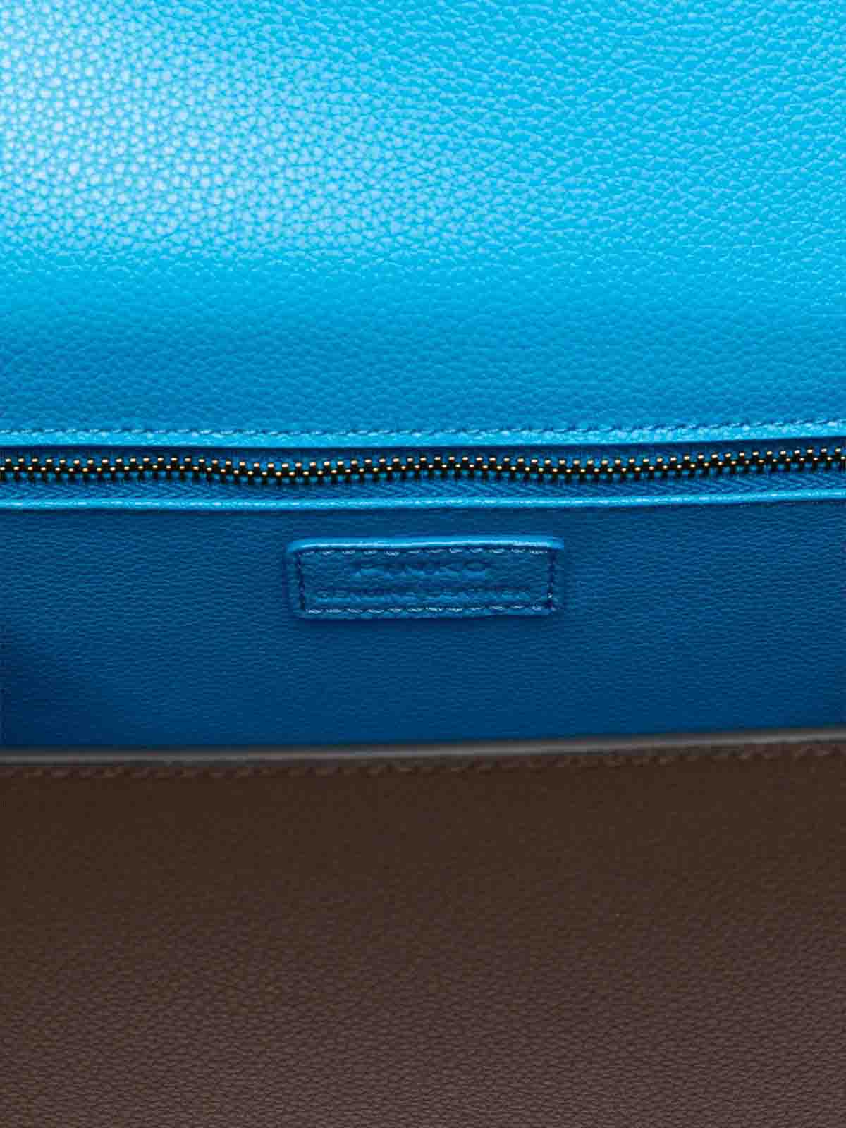 Solapa marrón y azul, esta pieza viene completa con una bolsa protectora para el polvo.
