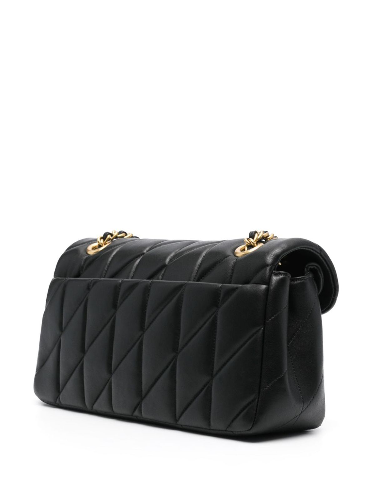 Placa con el logotipo acolchada en tono dorado negra en la parte superior desplegable, cierre a presión, correa de hombro ajustable de piel y eslabones de cadena, bolsillo trasero con cierre magnético, bolsillo frontal con cierre magnético, forro completo, parche con logotipo interno, bolsillo interno con cierre de cremallera, compartimento dividido, herrajes dorados