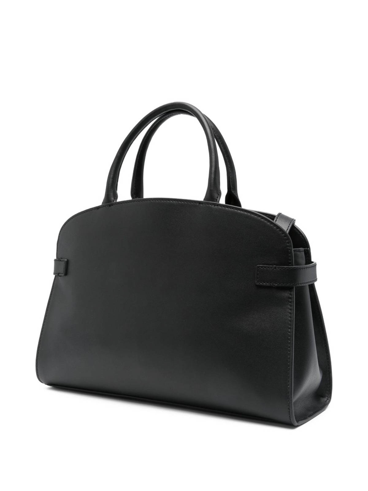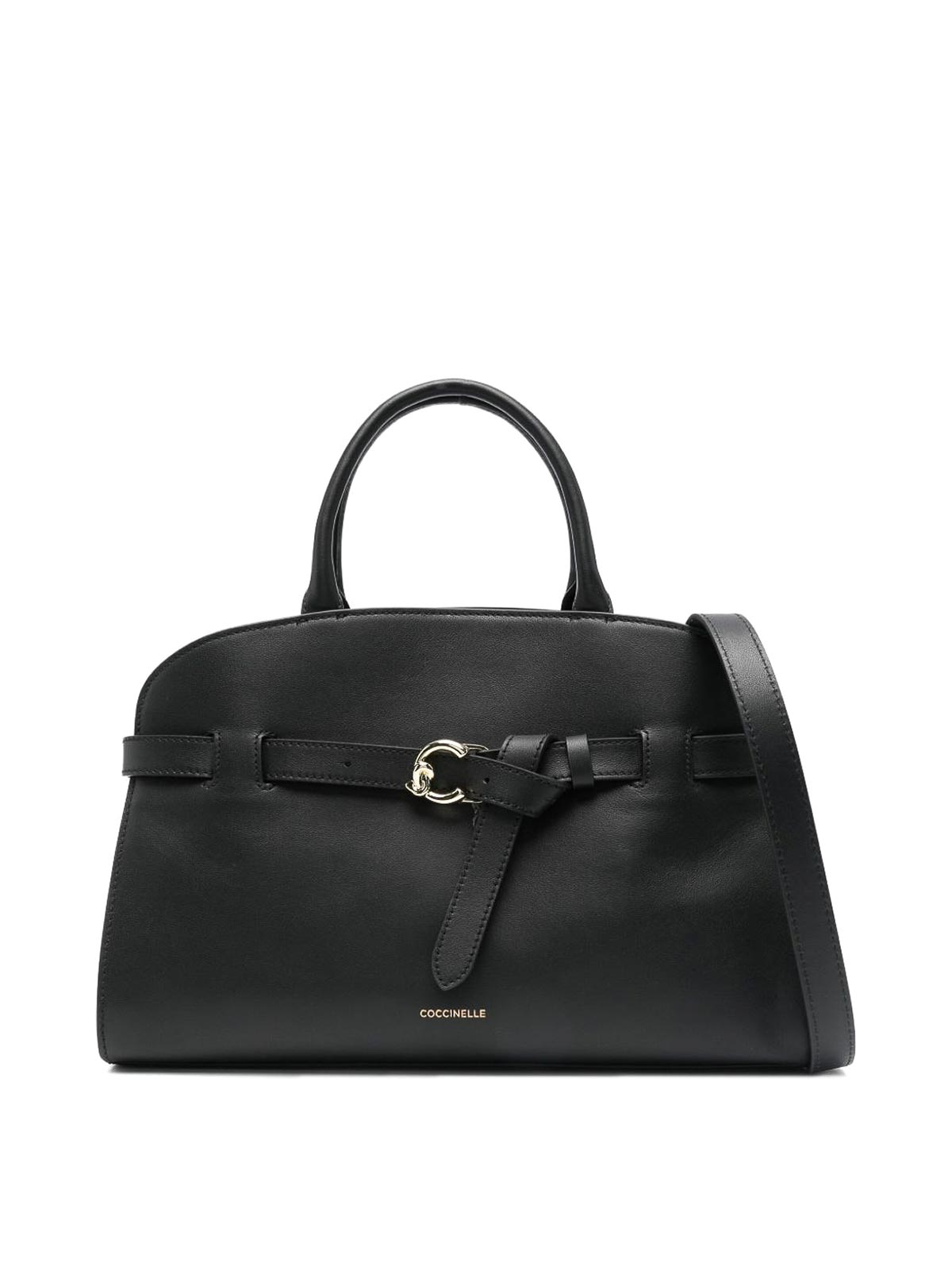 Cinturón negro con hebilla, asas superiores, correa de hombro desmontable
