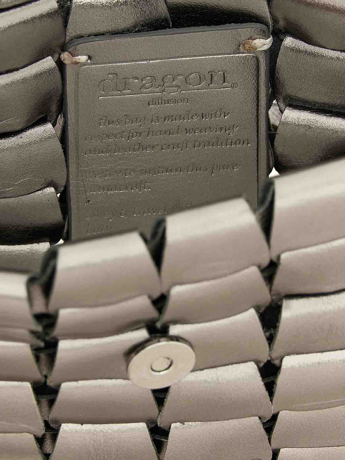 Bandolera tejida a mano con forma de «eslabones», caracterizada por correas que forman medallones conectados entre sí, como una cadena, solapa magnética sin forro, correa de hombro ajustable, un colgante envejecido en forma de medalla de San Cristóbal en homenaje al santo patrón de los viajeros, está cosido a mano en el interior de cada bolso Dragon Diffusion, el sello de autenticidad de la marca