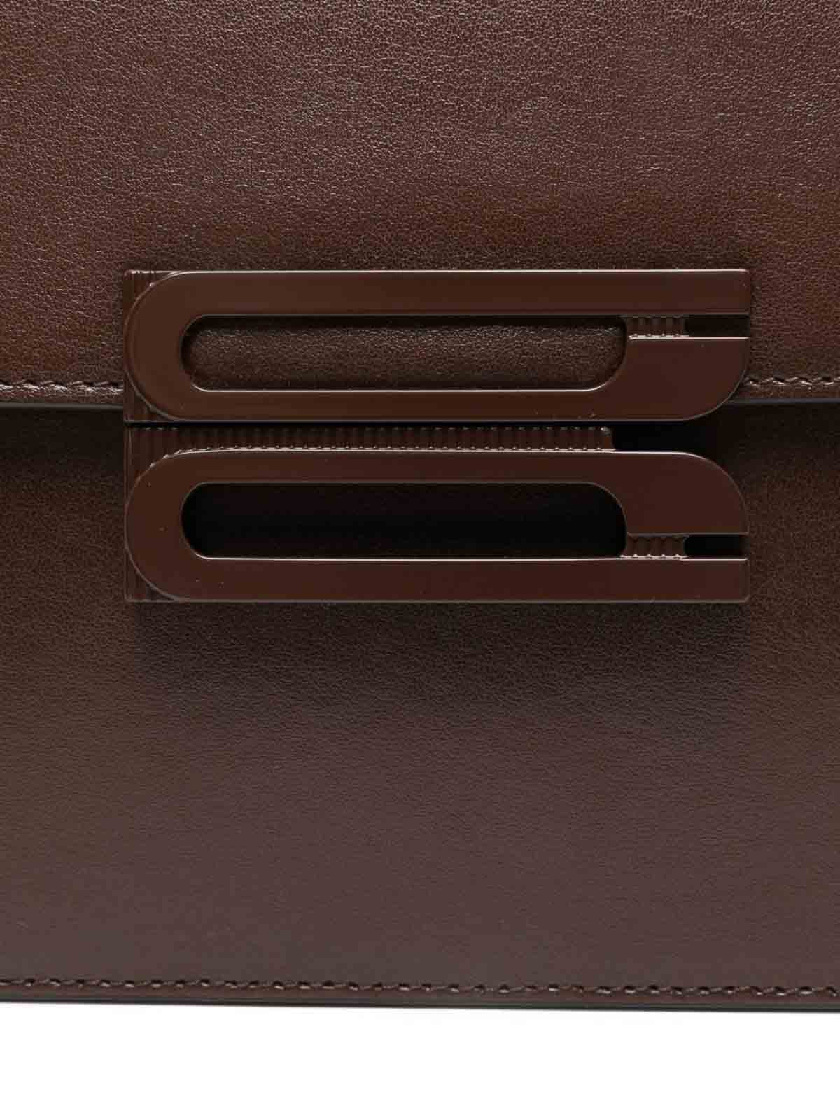 Bandolera Dorian de piel de becerro marrón oscuro con correa de hombro ajustable y extraíble. Cierre de broche con logotipo.
