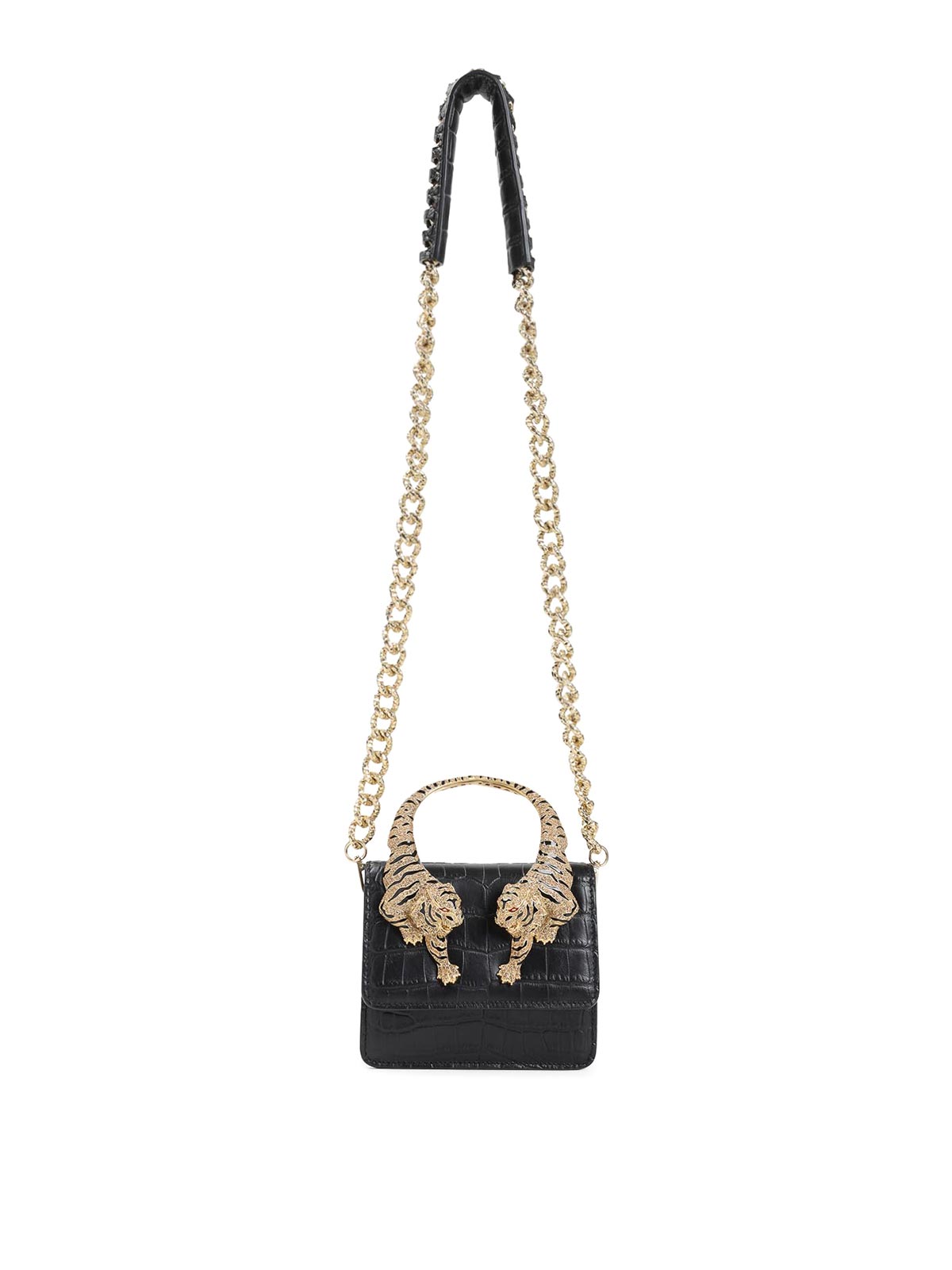 Bolso de hombro Roberto Cavalli con solapa pequeña, negro, rugido, bandolera negra, correa de hombro con cadena desmontable en tono negro, adorno en D metalizada en tono D, solapa de tigre en la espalda, letras en la espalda, logotipo, un compartimento principal, herrajes en tono