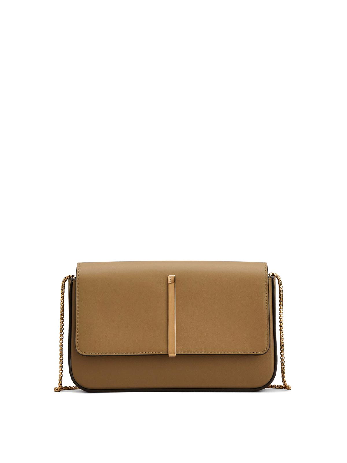Blusa plegable marrón camel con cierre magnético y correa de hombro con eslabones de cadena, compartimento principal