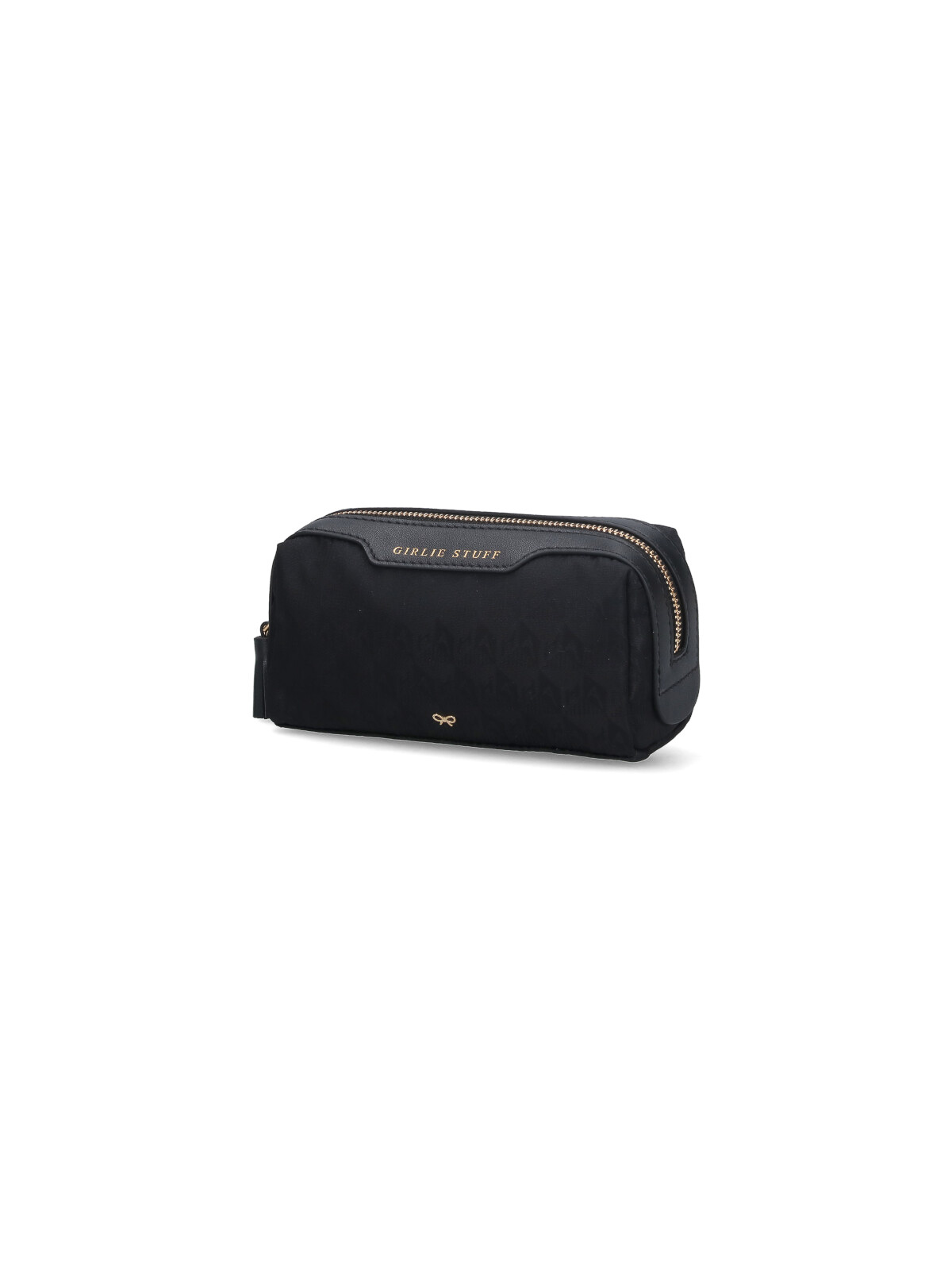 Funda girlie stuff anya hindmarch, acabados en charol negro, logotipo dorado en relieve, logotipo frontal, lazo de metal dorado, cremallera frontal, un solo compartimento