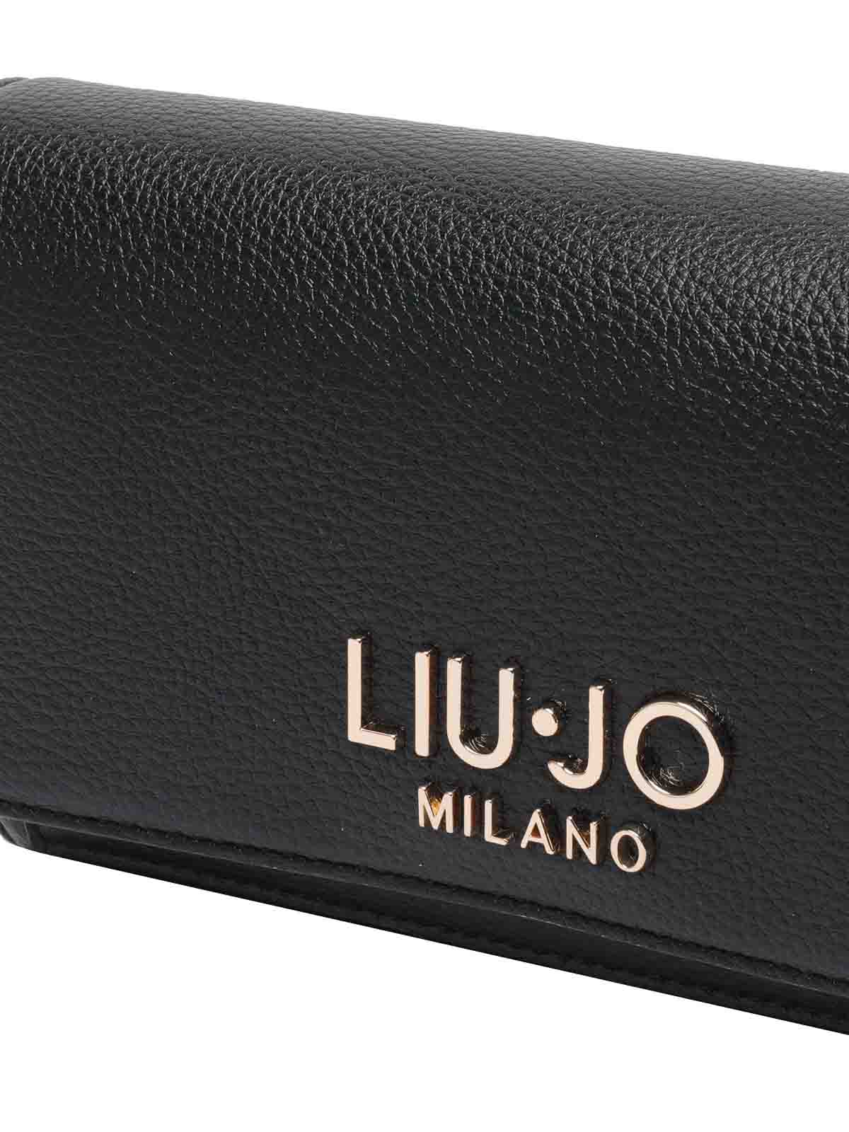 Bolsita negra con el logotipo de Liu jo, secciones magnéticas, ranuras, monedero, correa de cadena adaptable, logotipo frontal,