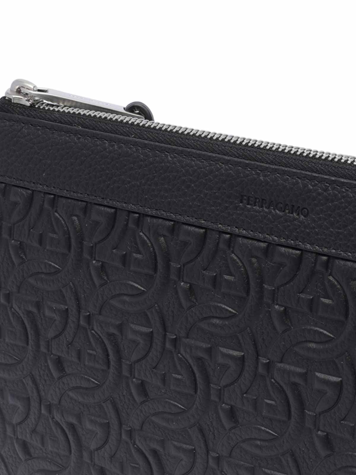 Bolso estilo gancini negro Ferragamo, secciones con cremallera, bolsillos abiertos, correa para la muñeca, logotipo gancini por todas partes
